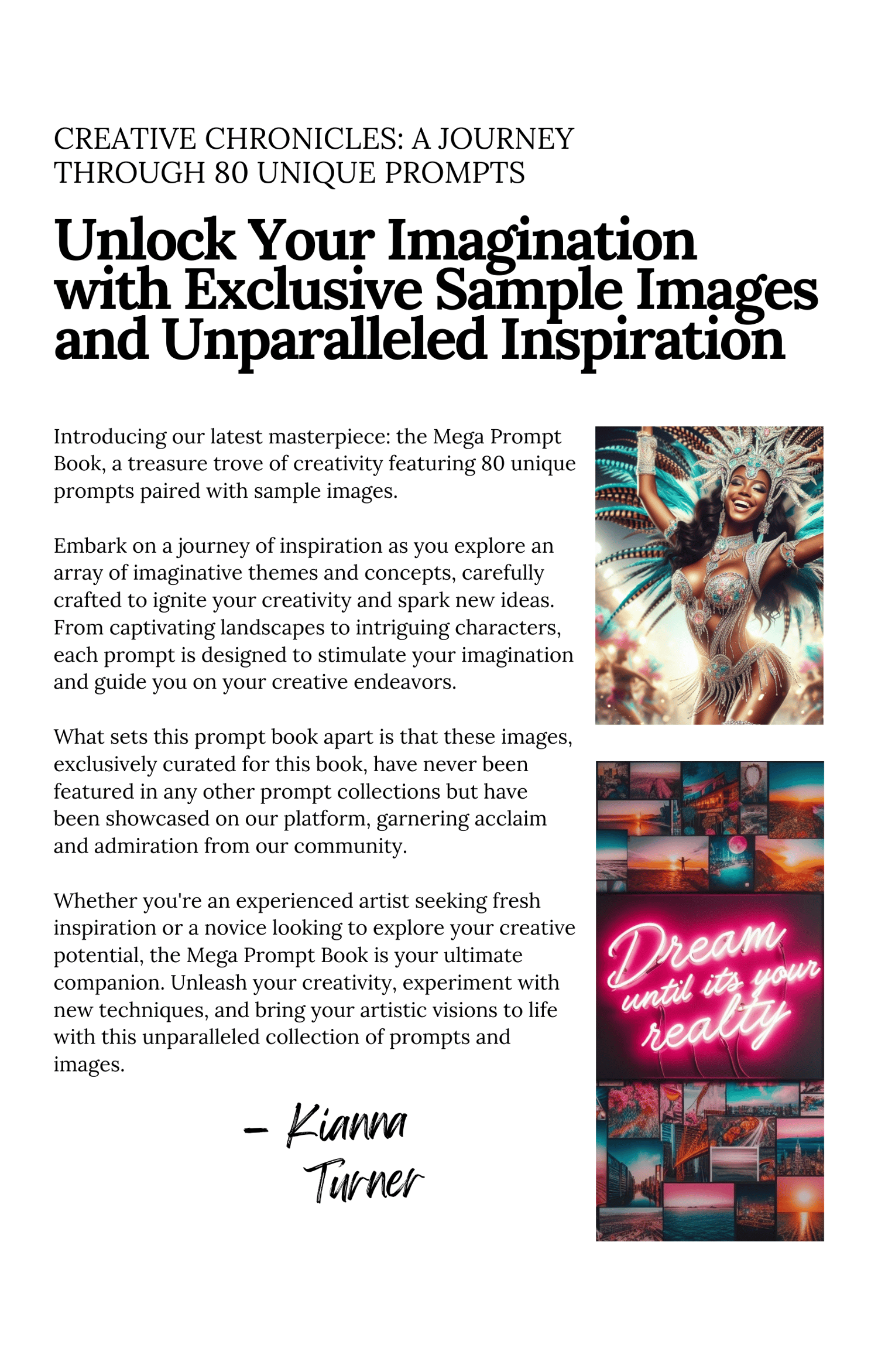 Whether you're a seasoned artist seeking fresh inspiration or a budding creator exploring your creative potential, the Mega Prompt Book is your ultimate companion. Unleash your creativity, experiment with new techniques, and bring your artistic visions to life with this unparalleled collection of prompts and images.