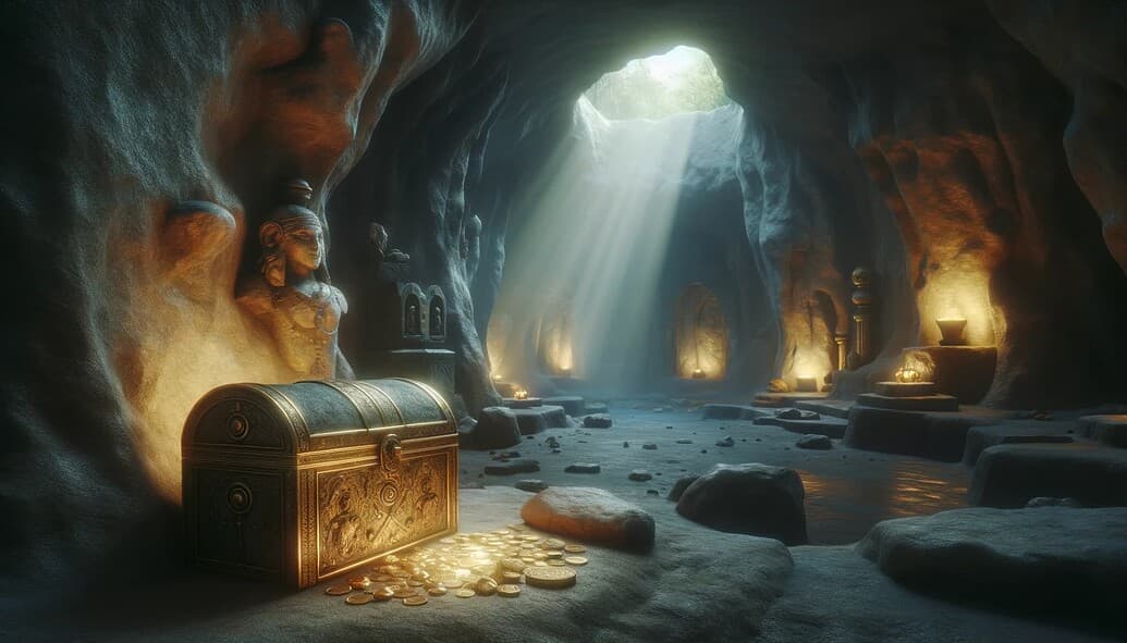 After a perilous journey, Aarav found the cave filled with gold, jewels, and a magnificent statue of Kubera. The statue spoke, revealing that true wealth is not just material but lies in wisdom, kindness, and the joy of giving.
