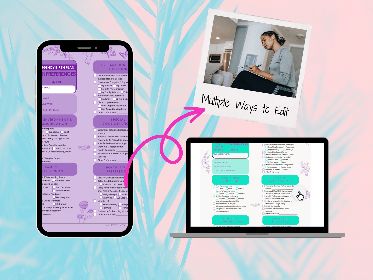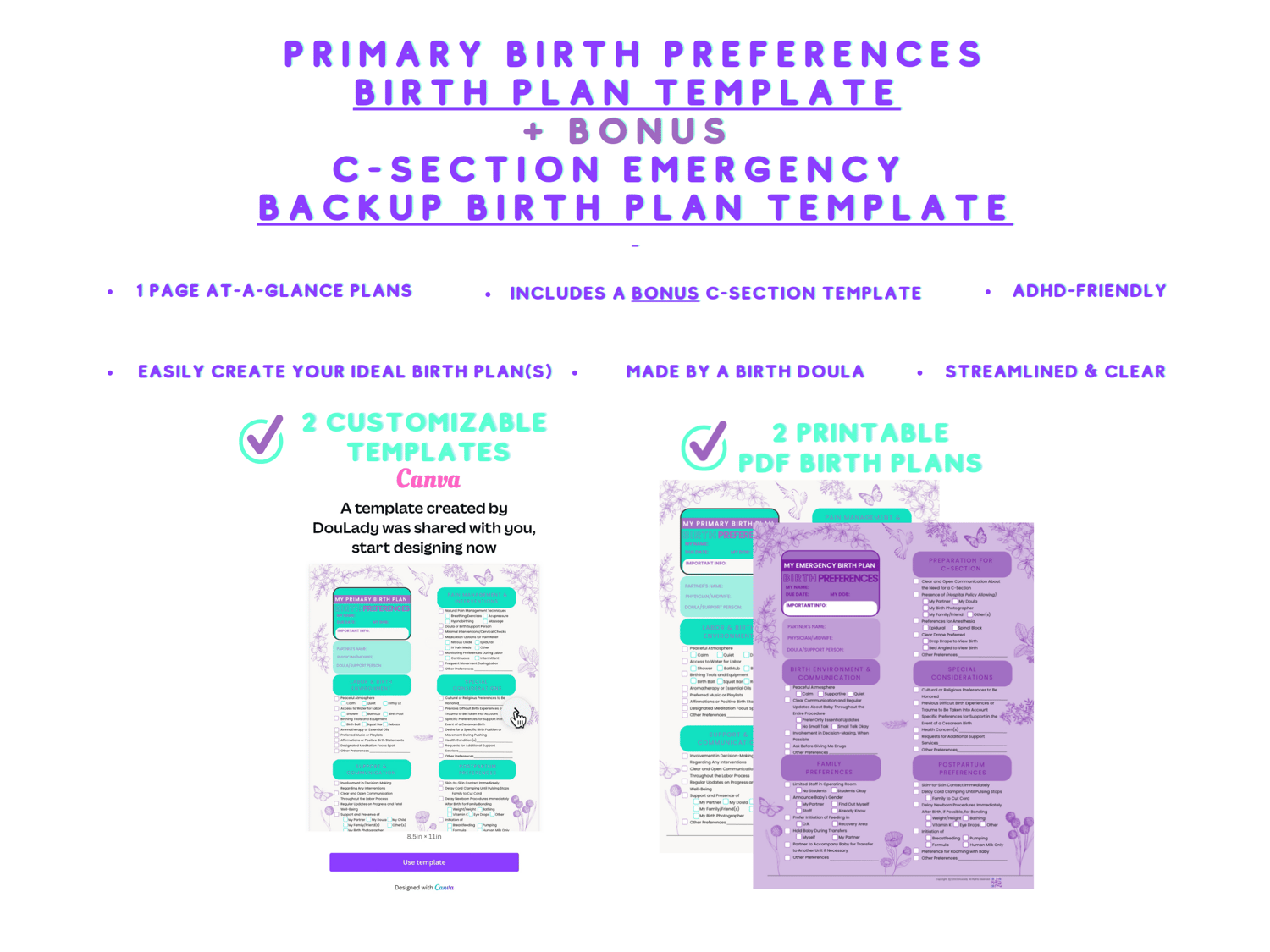 Feel empowered and well-prepared with our comprehensive birth plan template and Cesarean (C-section) template. Customize it to your heart's content and experience the serenity that comes with knowing all the important details are beautifully organized and ready to guide you through your special moment. Download yours today!