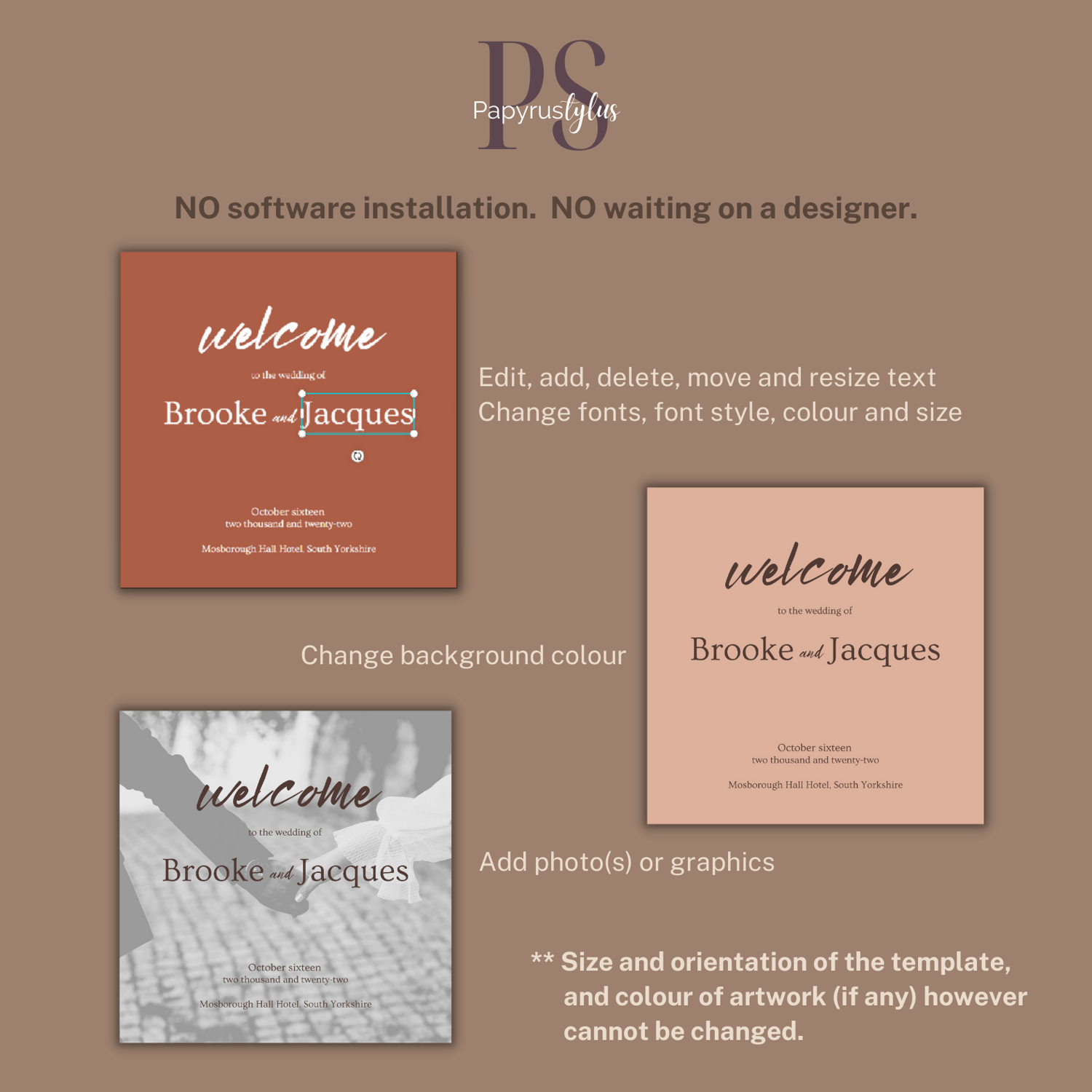 Chic and stylish. While the word "welcome" is presented in a modern script font, your names and essential information are displayed below in a beautiful typography. You can easily customise it, from fonts and colour to background image, to match your wedding theme.