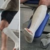 Here we see a man who was particularly unlucky. When he gets out of the car, we can see a split plaster SLC on his foot. So far so good. But then we see another cast: his wrist also probably suffered something in his accident, so he also received a forearm cast. Arm and foot parallel in a cast make walking on crutches almost impossible. That's probably why he hops on one leg to the entrance and quickly grabs a wheelchair himself.