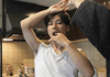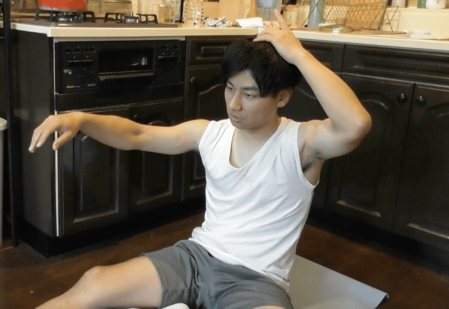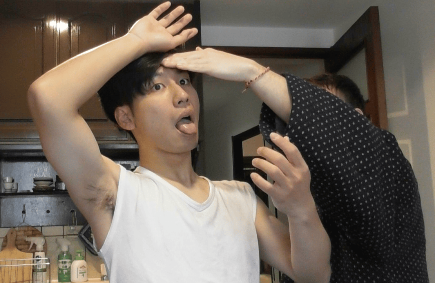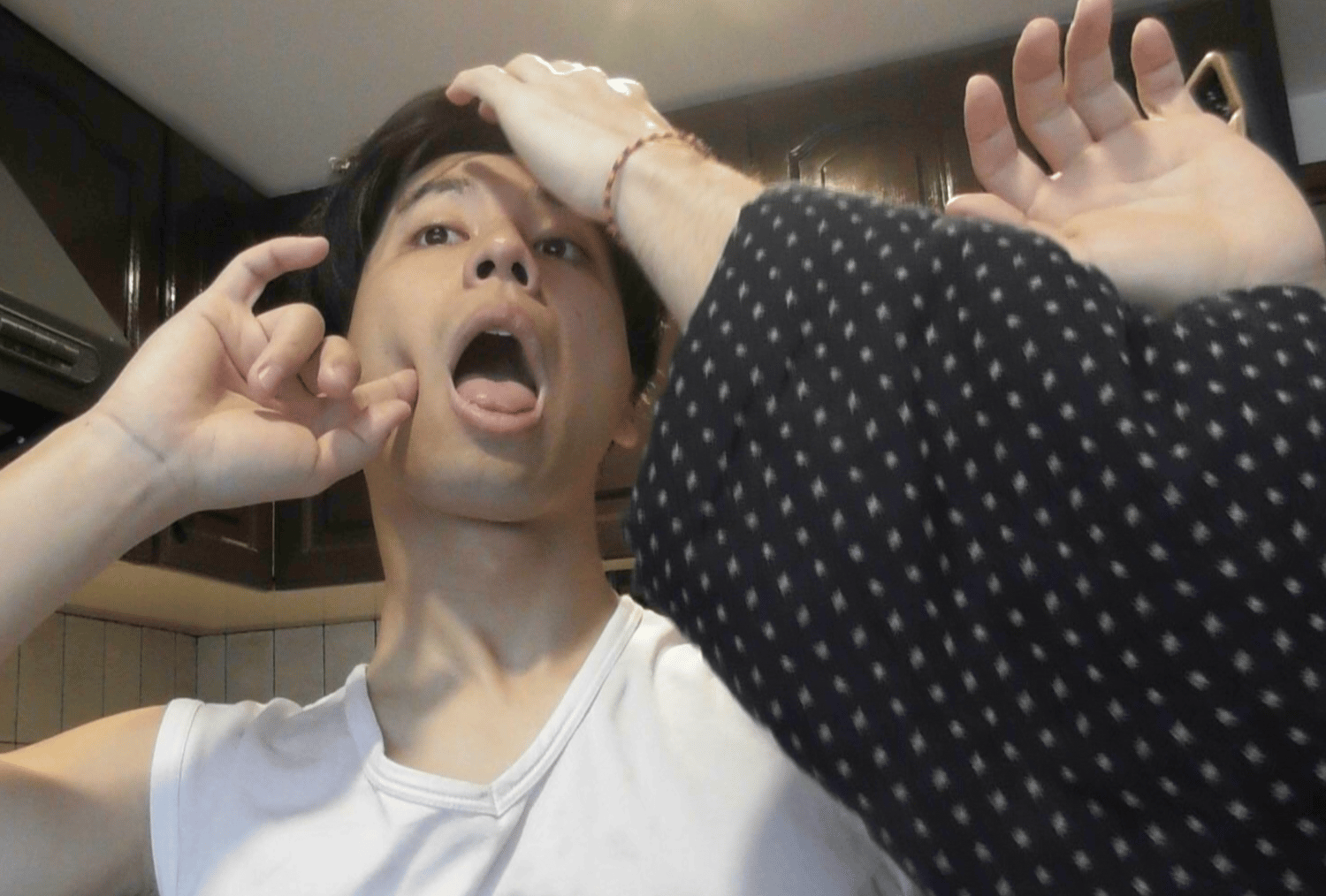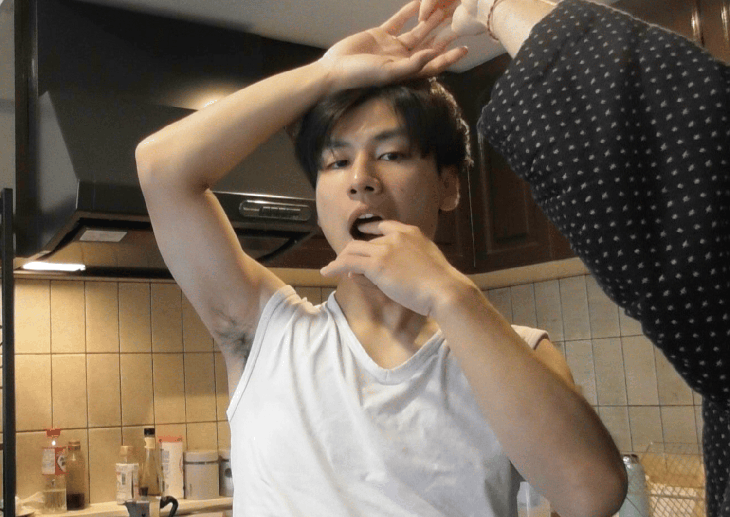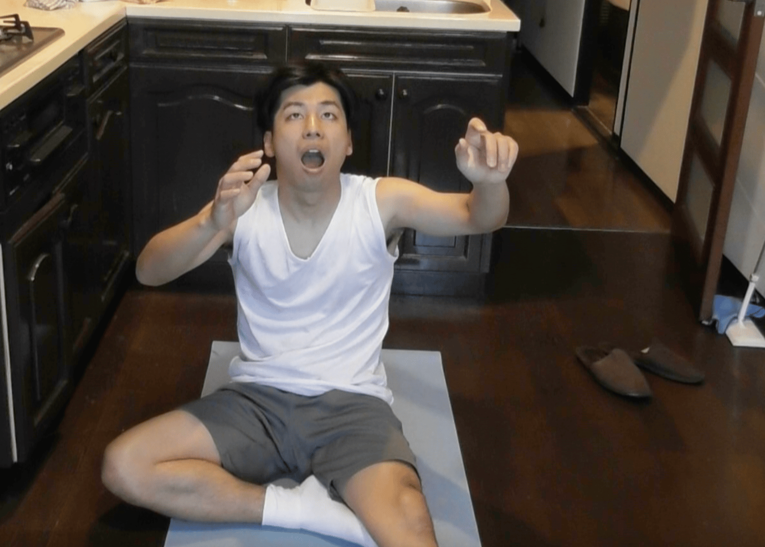 Taku is showing some stretching poses, when he is frozen on the floor. I move his body like a mannequin and play with his frozen face.