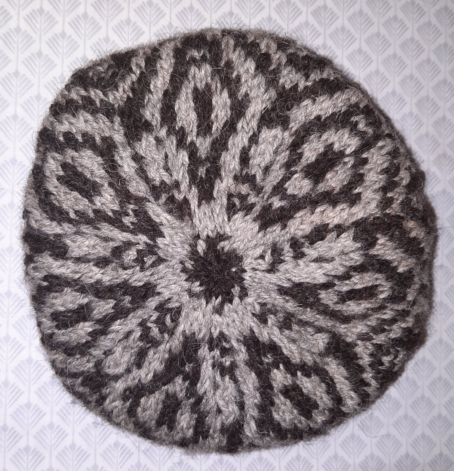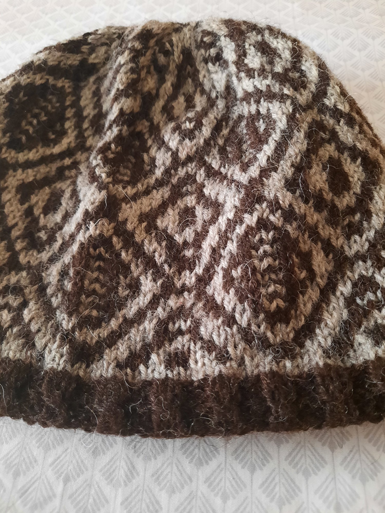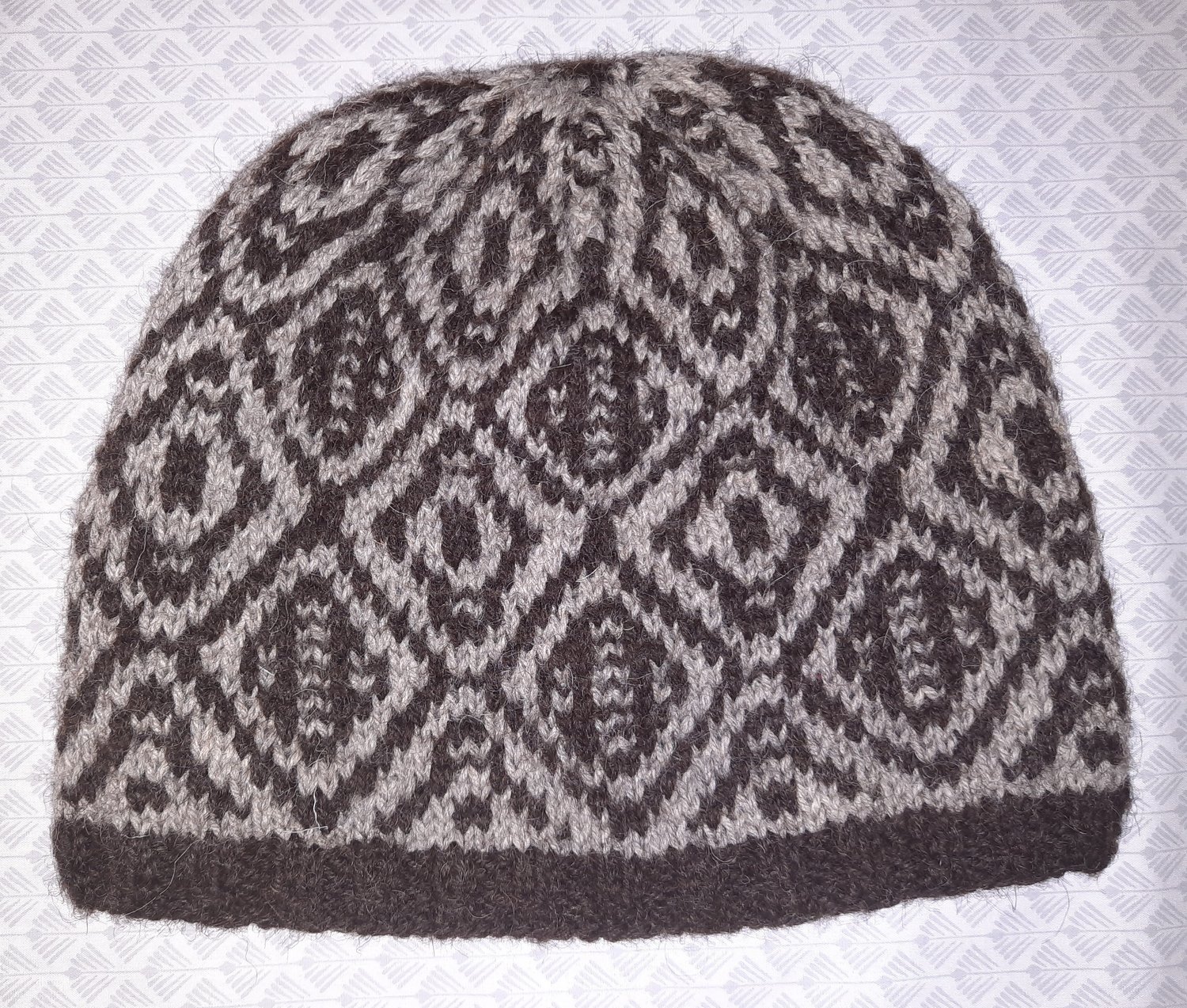 This hat utilizes the simple technique of working stitches in only one colour each row and slipping the rest, whilst achieving a strong graphic look in high contrast colours or a more muted look with lower contrast colours, but only ever working with one strand of working yarn at a time, producing a colour work look the easy way!