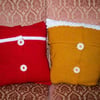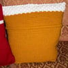 Materials: Stylecraft Special Aran, 3 x Gold (1709), 3 x Lipstick (1246), 1 x White (1010), 4.00mm hook, 4x 3cm Buttons, 40cm cushion pads.