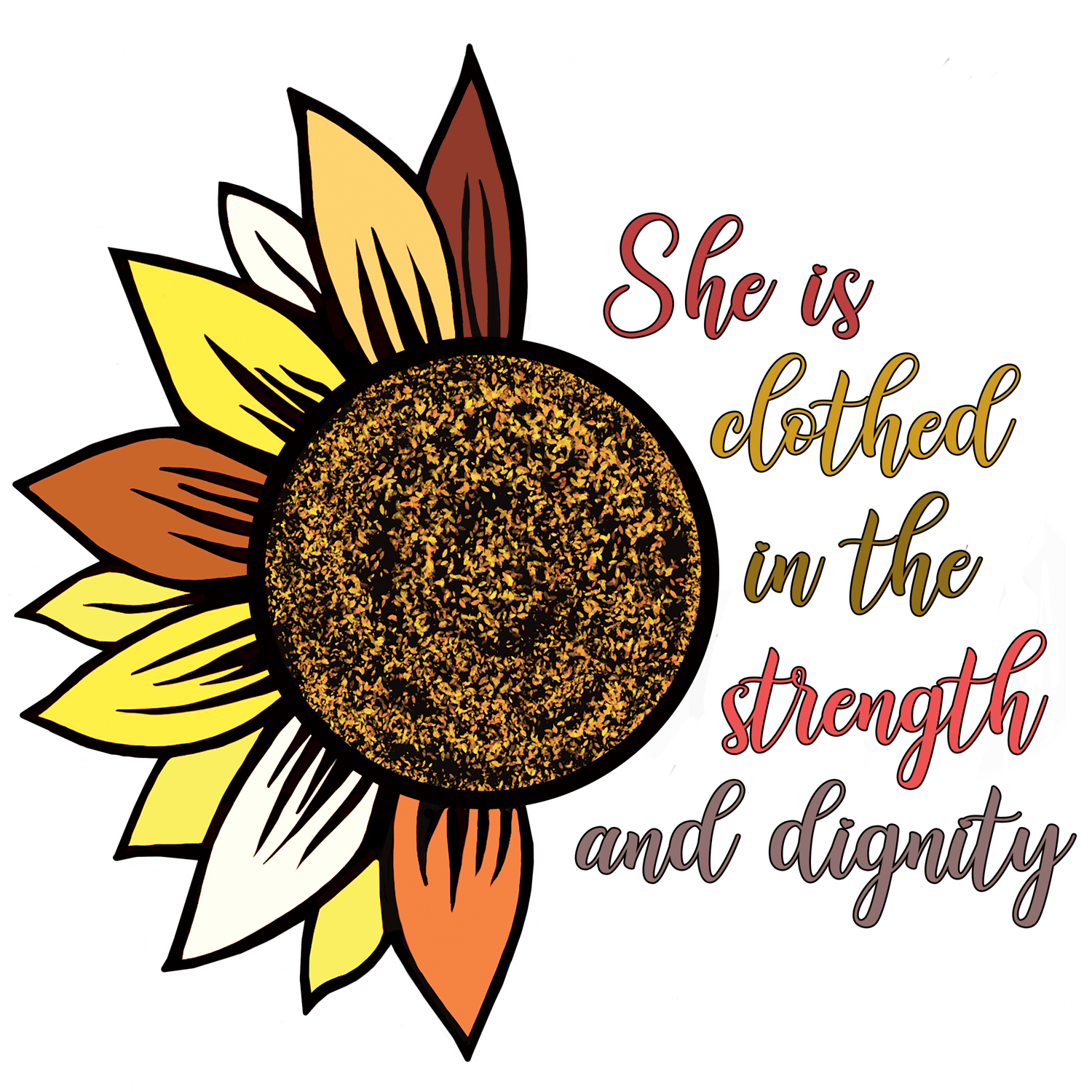 - Celebrate feminine faith and power with this vibrant sunflower design featuring the inspirational quote, “She is clothed in strength and dignity.” Perfect for Christian apparel, digital downloads, stickers, wall art, and gift ideas. Ideal for women of faith, Proverbs 31 warriors, and Kingdom entrepreneurs.