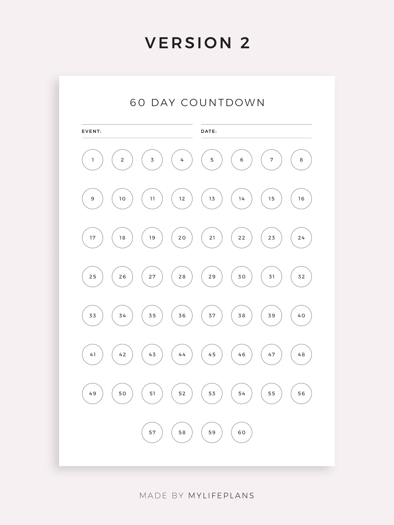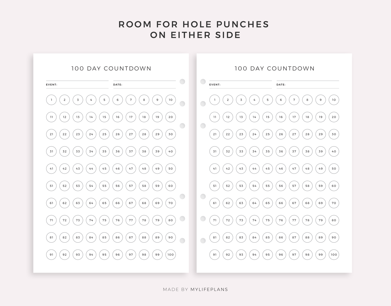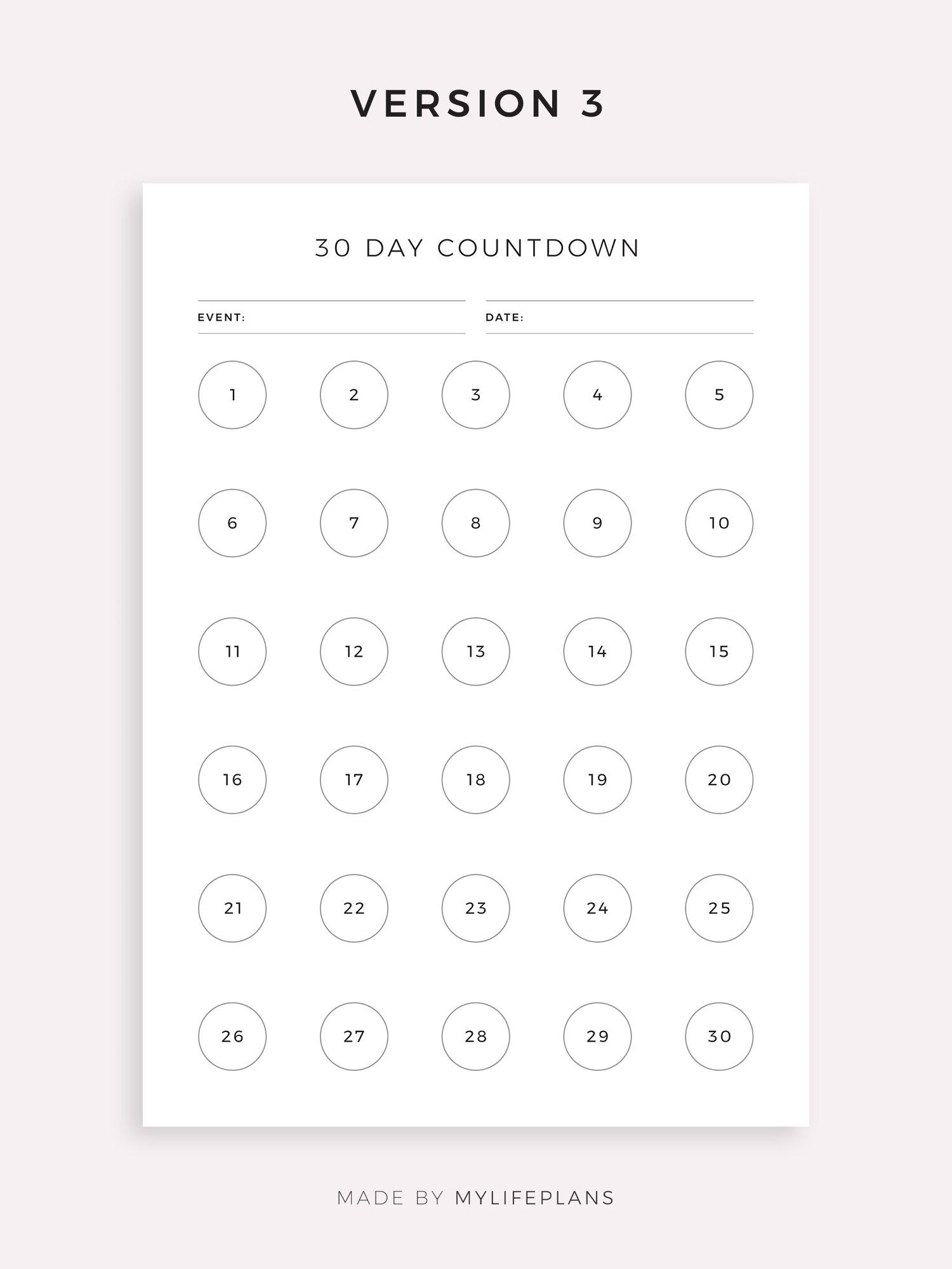 This is a printable 30, 60, 100 day countdown tracker — just download, print, and start using it right away.