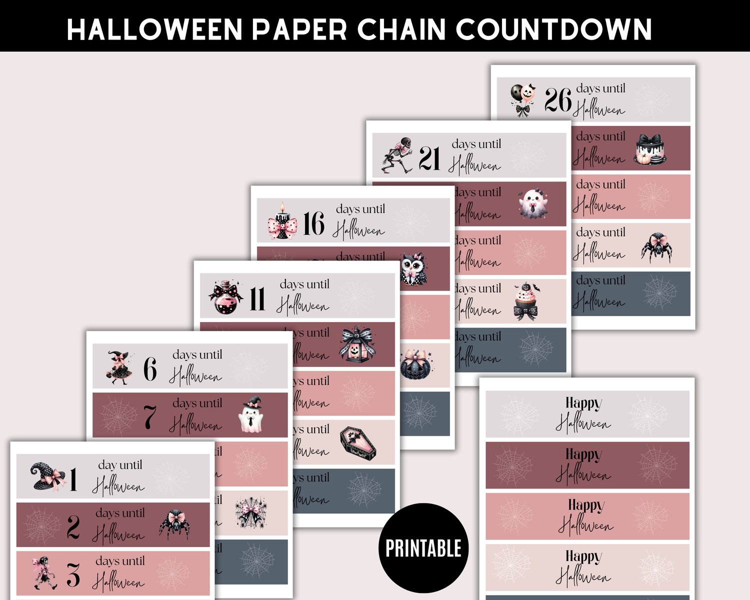 Transform your Halloween Decor with our Pink Coquette Halloween 30-Day Paper Chain Countdown! This decoration transforms the spooky season into a chic, whimsical celebration, infused with enchanting pastel hues and a touch of vintage glam.