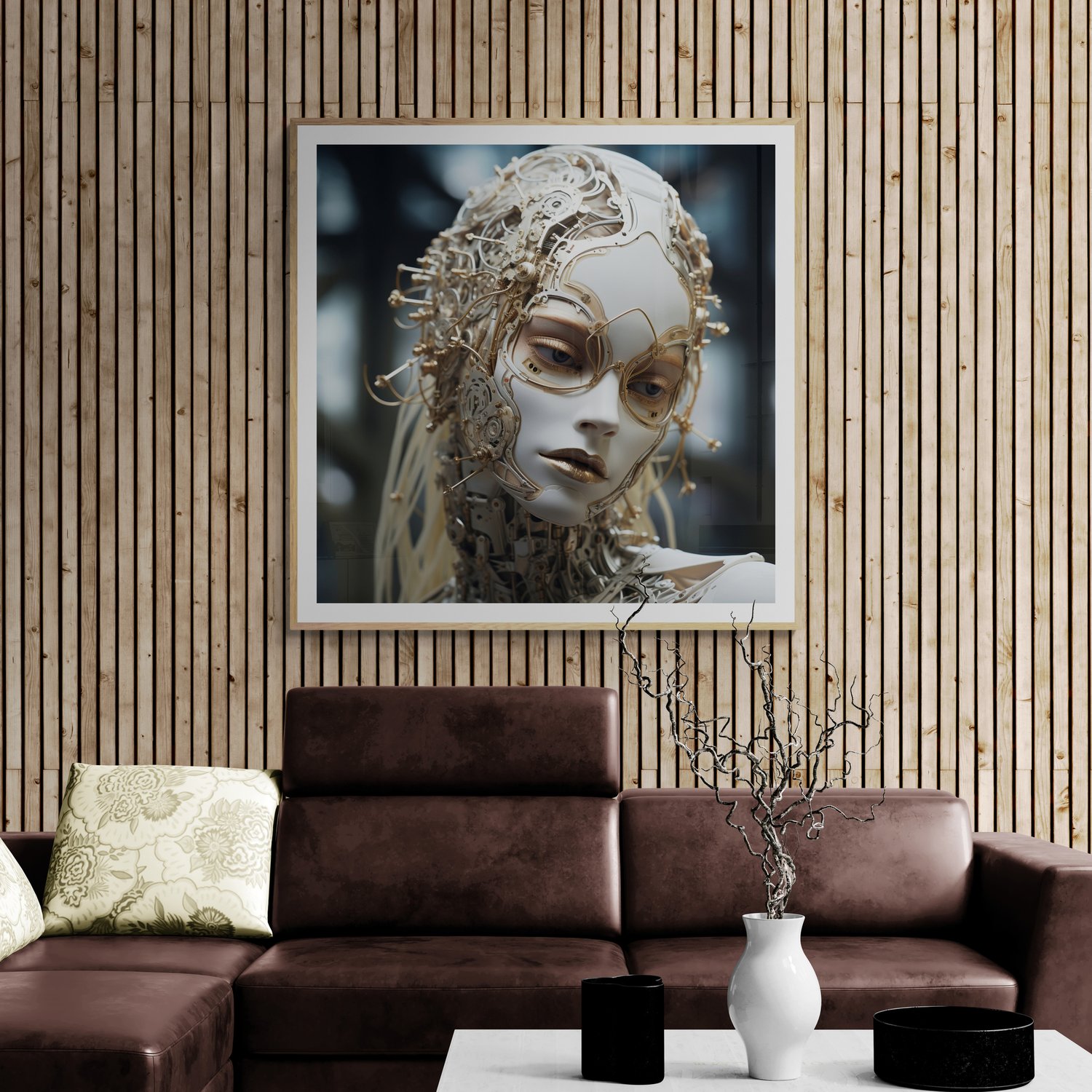 AI artwork that encapsulates the essence of futuristic elegance and cybernetic allure. This striking piece presents a visually compelling portrayal of a cyborg woman, adorned in white and gold, evoking a sense of transcendence and technological beauty.