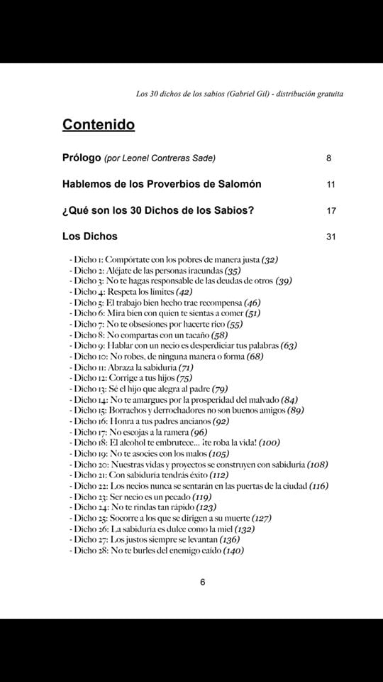 LOS 30 DICHOS DE LOS SABIOS es mi libro Nº 7. En él se aborda el tema de la sabiduría desde una óptica práctica, para este análisis de los pasajes bíblicos de Proverbios 22:17 al 24:22 explicando los versículos de una manera sencilla y aplicable al 'día al día'. Pero además, en mi libro abarco cinco temas adicionales, 4 de ellos explicados por cuatro especialistas y el último ––el epílogo–– específicos por mí: “Cómo llegar a ser sabio”. Precio: 1 dólar Descárguelo directamente desde mi tienda virtual.