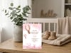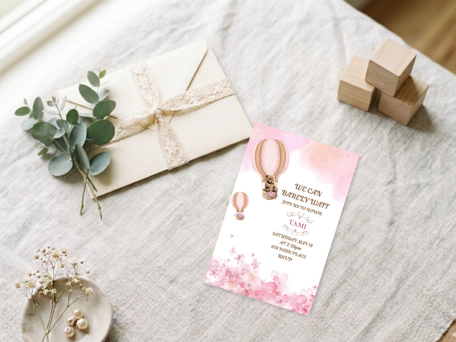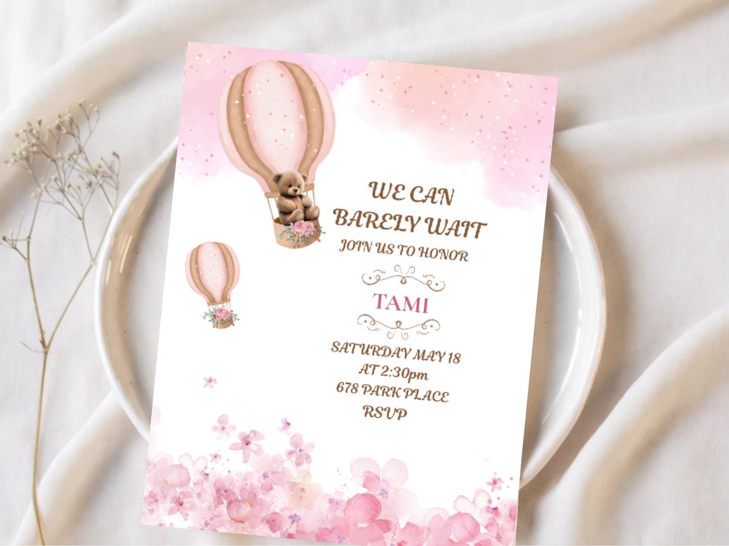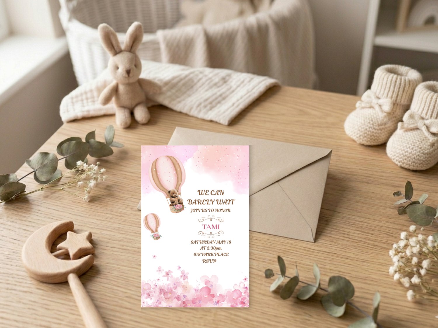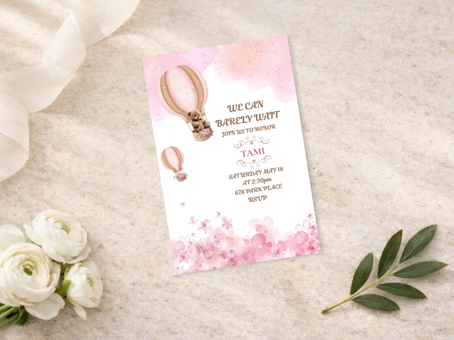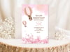 Welcome your little one in style with this sweet boho baby shower invitation! Featuring a charming watercolor bear floating in a hot air balloon, surrounded by soft blush pinks, floral details, and boho neutrals, this invitation is perfect for a baby girl or gender reveal celebration.