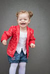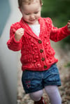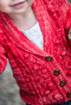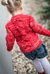 The cardigan is intended to be worn with about 2.5-5 cm / 1-2” of positive ease. When you choose a size do not rely solely on age but measure your child’s chest and choose the size accordingly. Sample shown in size 2 on 56 cm / 22” chest.