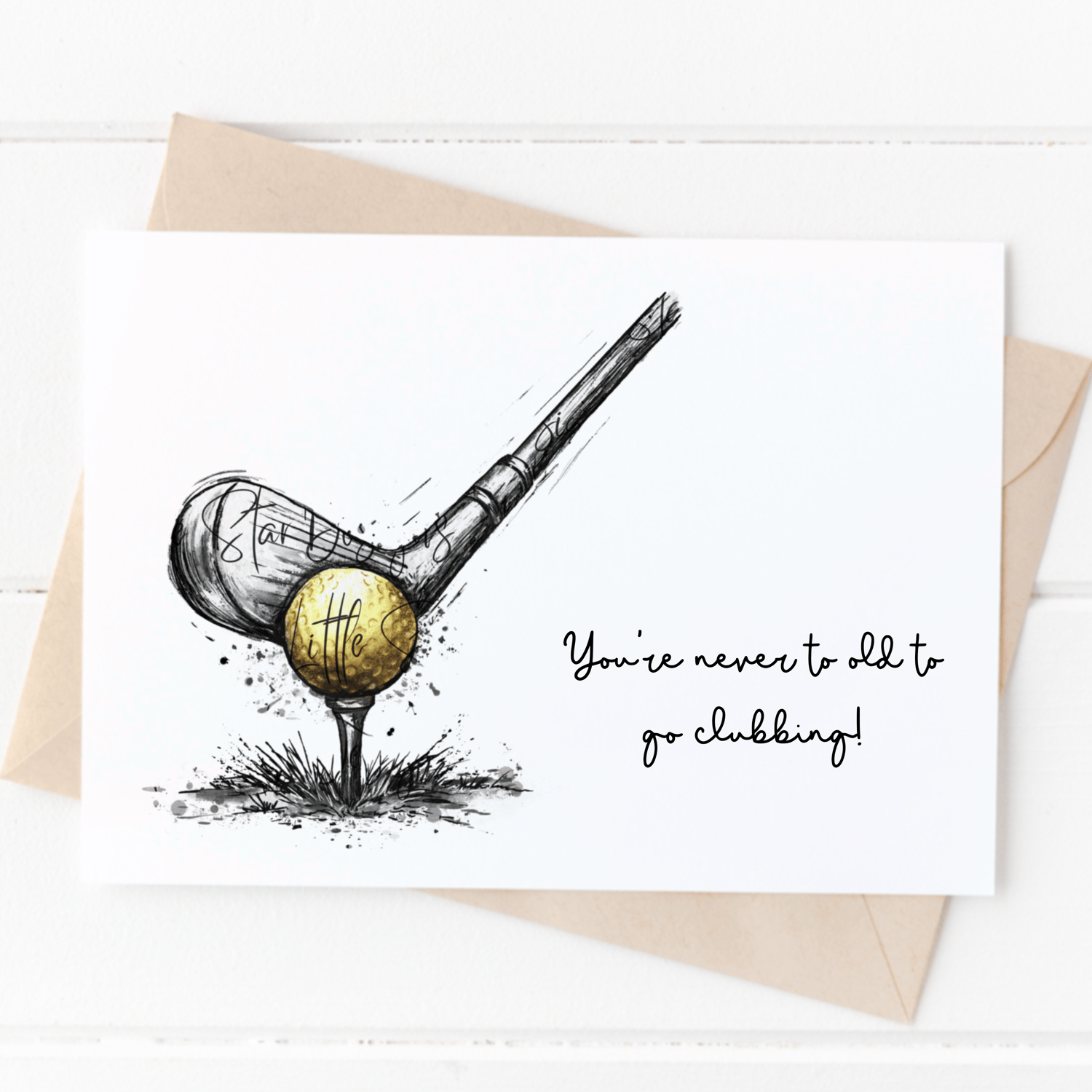 ⭐️ Inky grungy illustration featuring a golden gold ball being stricken with a golf club