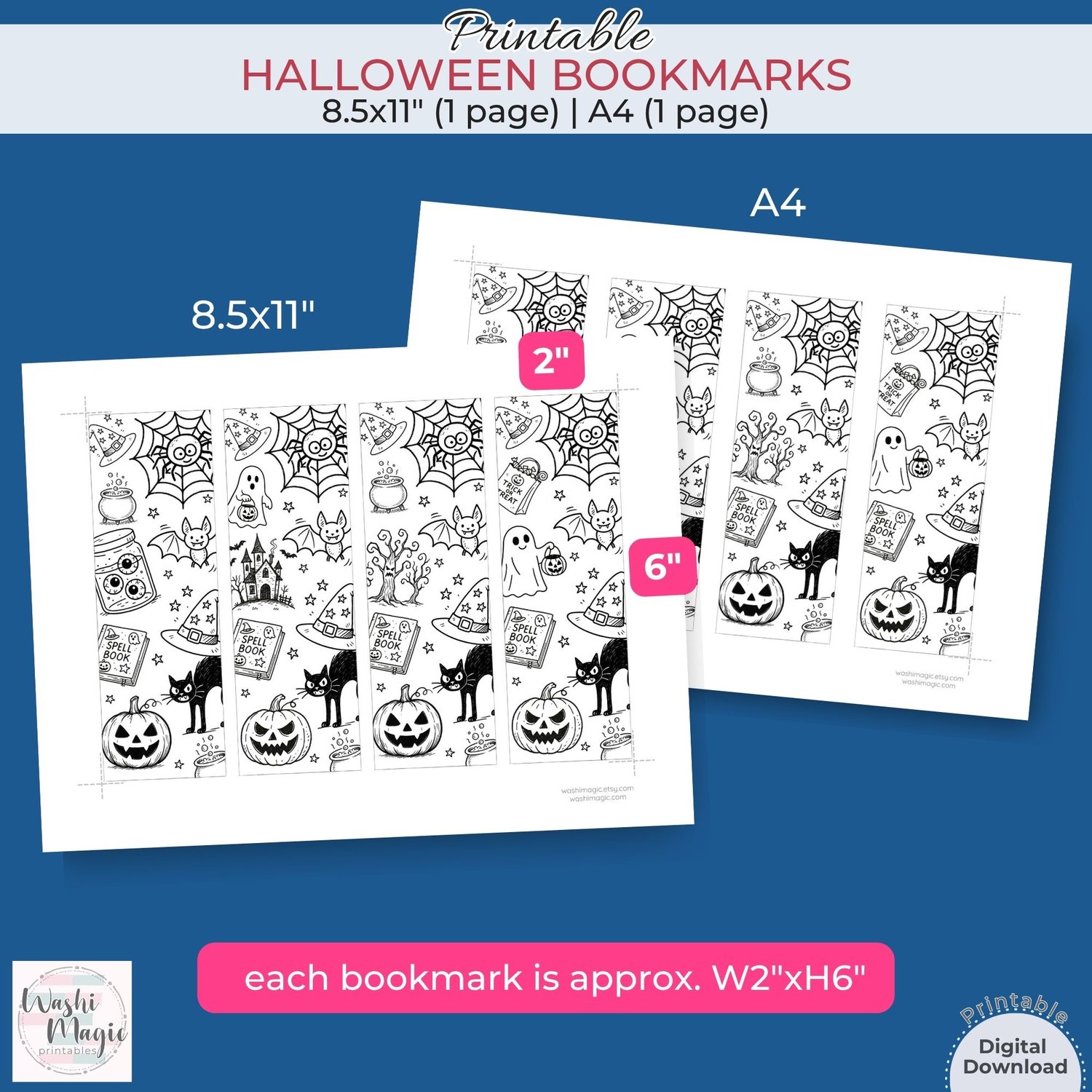 The size for each bookmark is slightly bigger 2.1"x 6.2" while designing. You may trim it down to 2"x6" or simply follow along the line to cut.