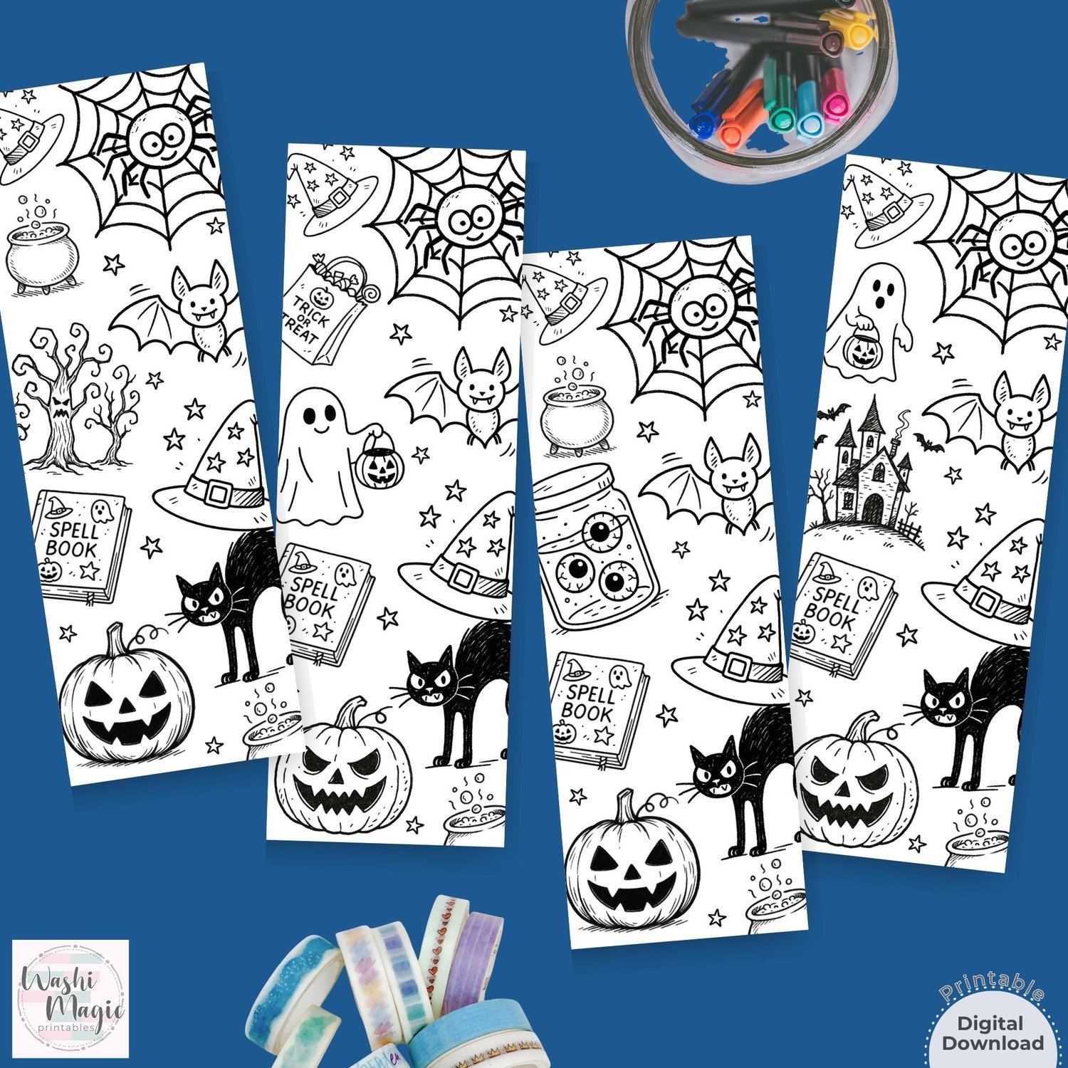 Halloween Coloring Bookmarks Printable Set of 4: Fun Black Cat Pumpkin Designs