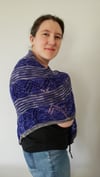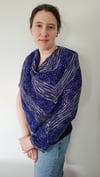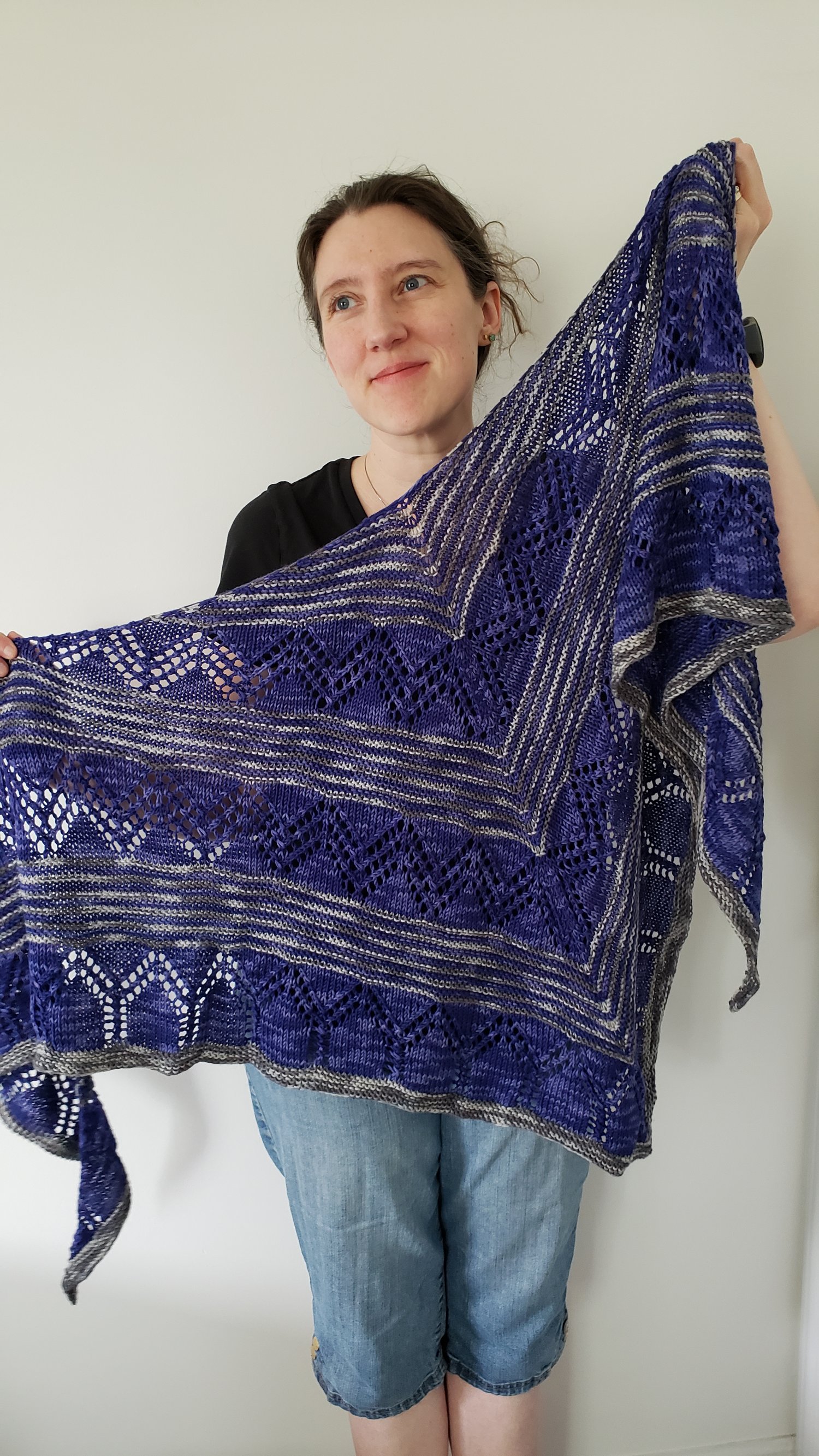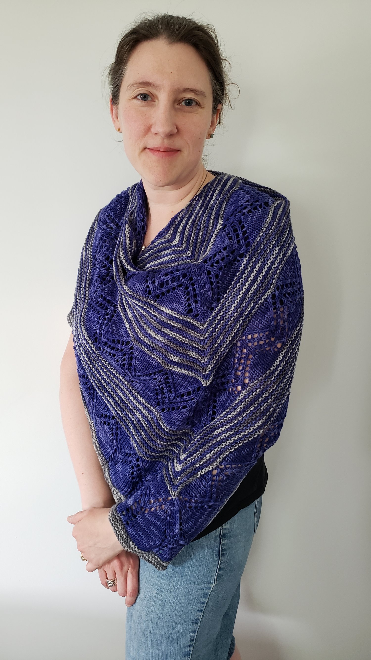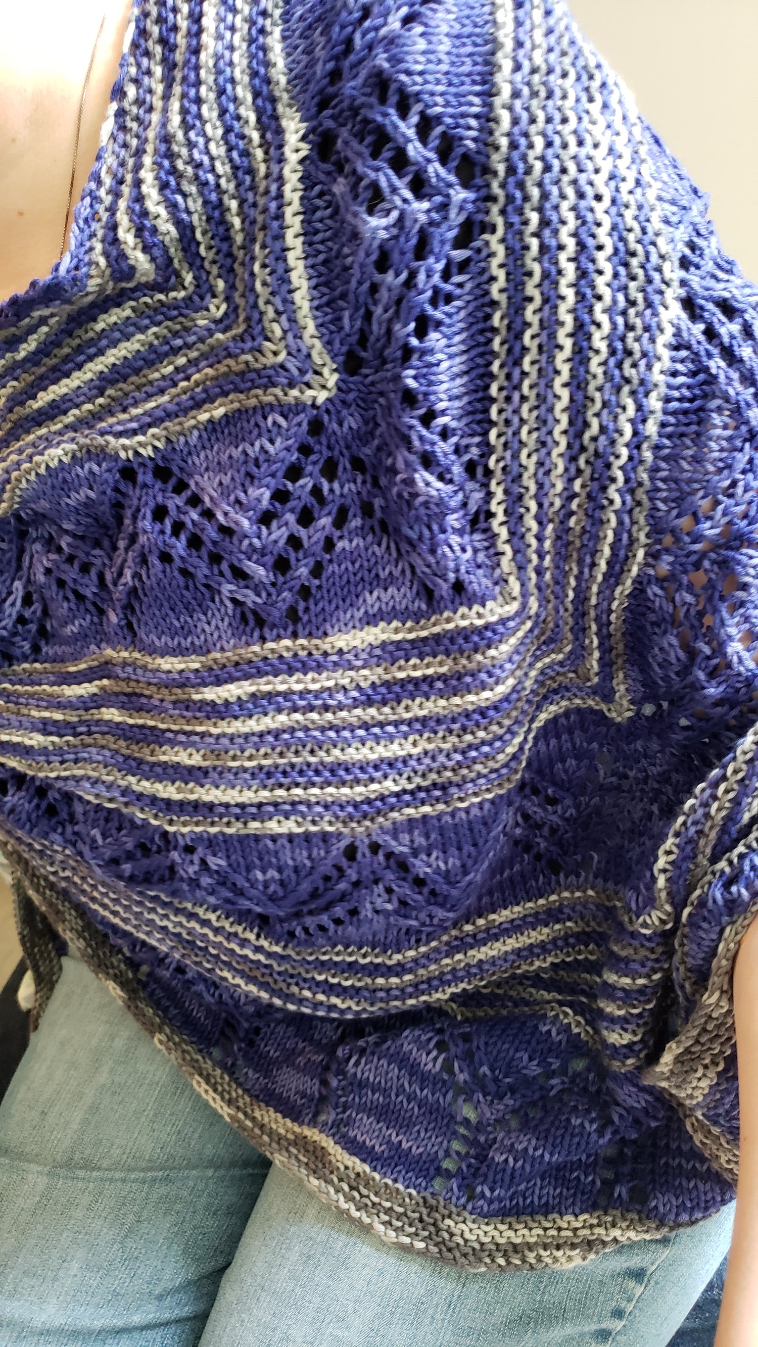 A fun and engaging knit, Dark Nebula is an elongated triangle shape, with alternating sections of two color garter stripes and single color chevron lace. Knit it in wool for a cozy fall shawl, or knit it in cotton, like mine, for an airy summer shawl.