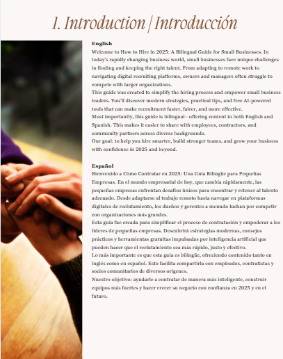 With compassion, real-world experience, and bilingual insights, this guide empowers you to hire smarter and build stronger teams, without the overwhelm. Whether you are just starting your small business, running a nonprofit, or growing your company, this resource was made to support you.
