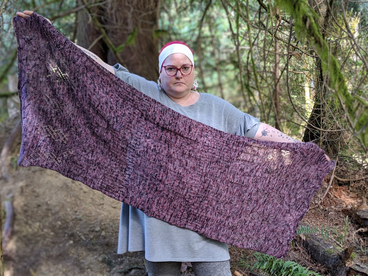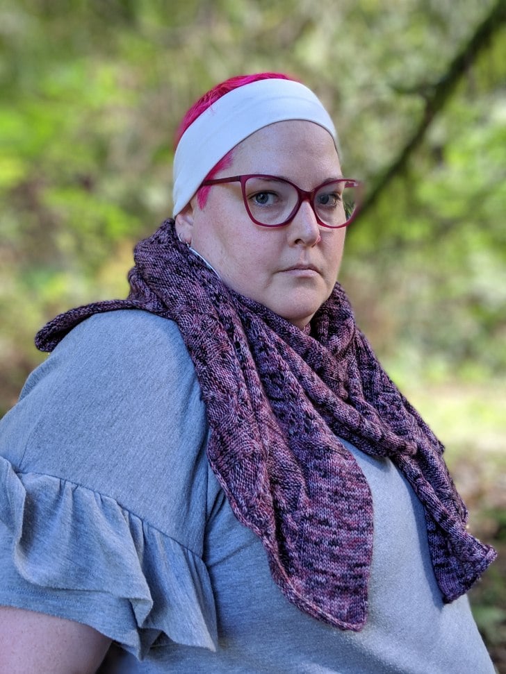 In designing this wrap pattern, I let different quotes from the catalogue of episodes inspire the design elements. This wrap is knit in two identical pieces & then connected via a three-needle bind-off using design elements from cables to lace to texture.