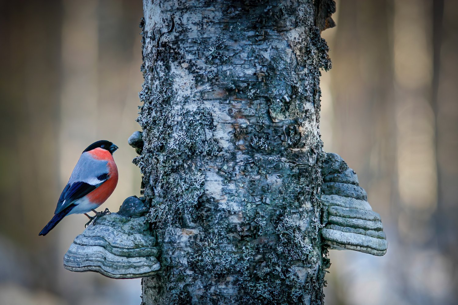Bullfinch male (Pyrrhula pyrrhula) sitting on hoof fungus