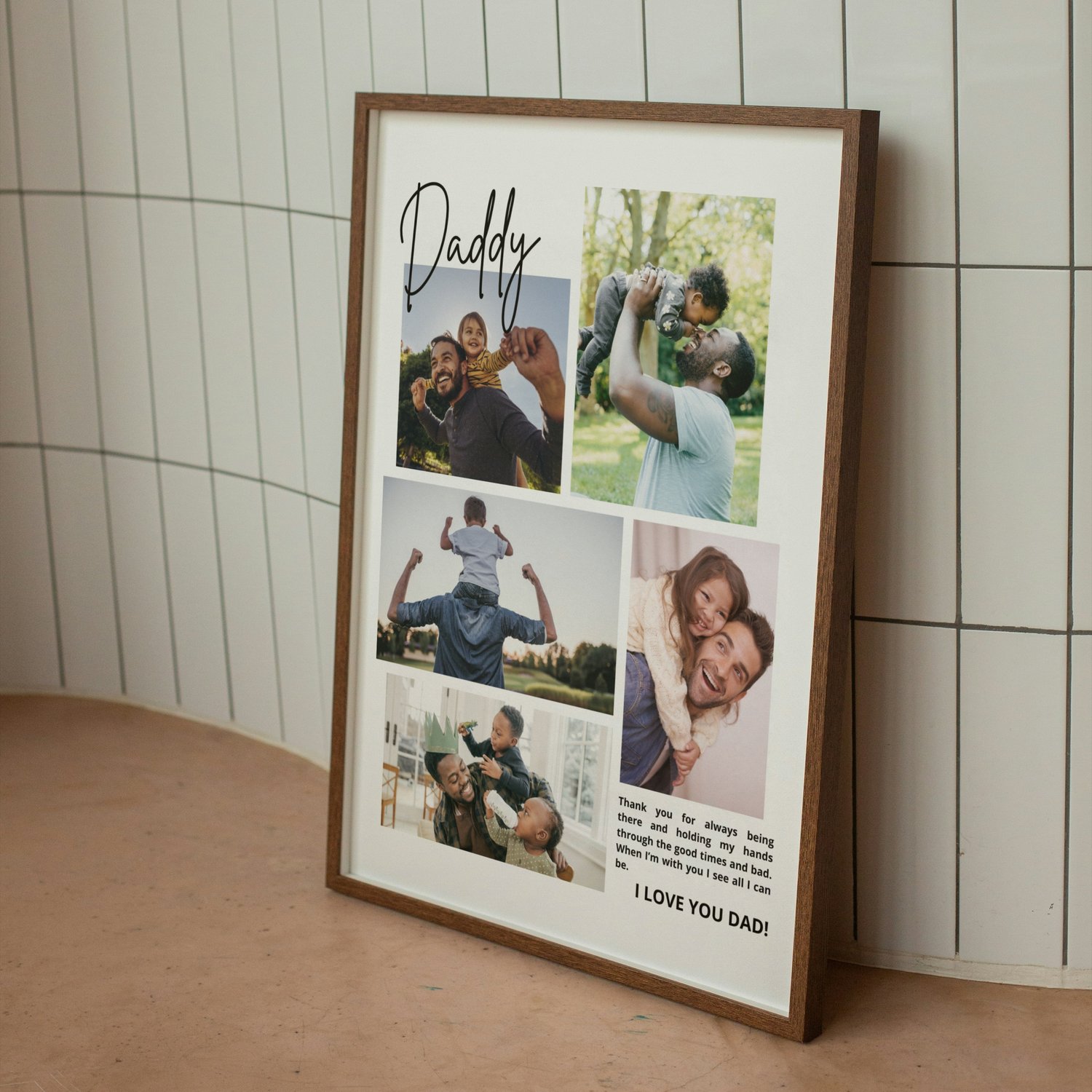 To create this special gift, simply send us 5 - 8 cherished photos of your choice to heartspeak@picturethisays.com. We'll transform and print them into a stunning piece of art that captures precious memories and celebrates the incredible bond you share with your father.