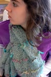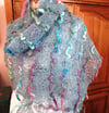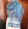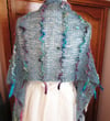 The fabric of this soft wrap takes inspiration from the colors and contrasting textures of the sea shore. The soft mohair yarn has an open, wavy stitch that “catches” the handspun in its threads. The handspun is left with loose ends to mingle with the lacy threads. Opposites play together to make a soft wrap or scarf that is a delight to wear.