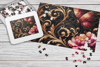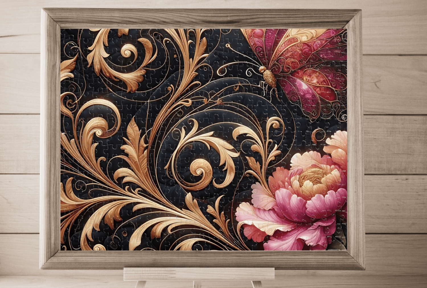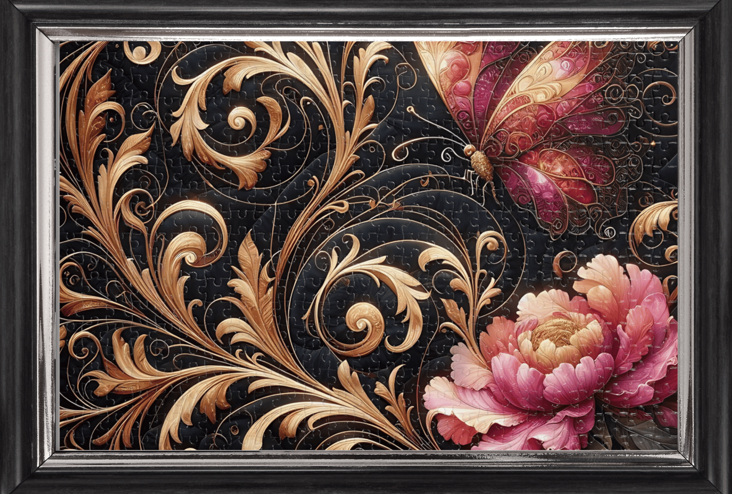 Presenting the enchanting "Whispers of Elegance The Baroque Butterfly and Blossom Puzzle," a jigsaw masterpiece that offers an ornate escape into the romantic world of Baroque art. Available in both a 1000-piece for the puzzle connoisseur and a 500-piece for those seeking a less intricate endeavor, this artwork features a delicate butterfly with wings that seem to be painted by the twilight itself, alighting upon the soft petals of a lush peony. Encased in a filigree of golden scrolls that add a touch of timeless luxury to the dark, quilted background, each piece fits seamlessly into another, crafting an experience that is as fulfilling as it is aesthetically pleasing. Whether you choose the path of the 1000-piece challenge or the 500-piece journey, this puzzle promises to become a beautiful art piece that captures the opulence and grace of a bygone era.