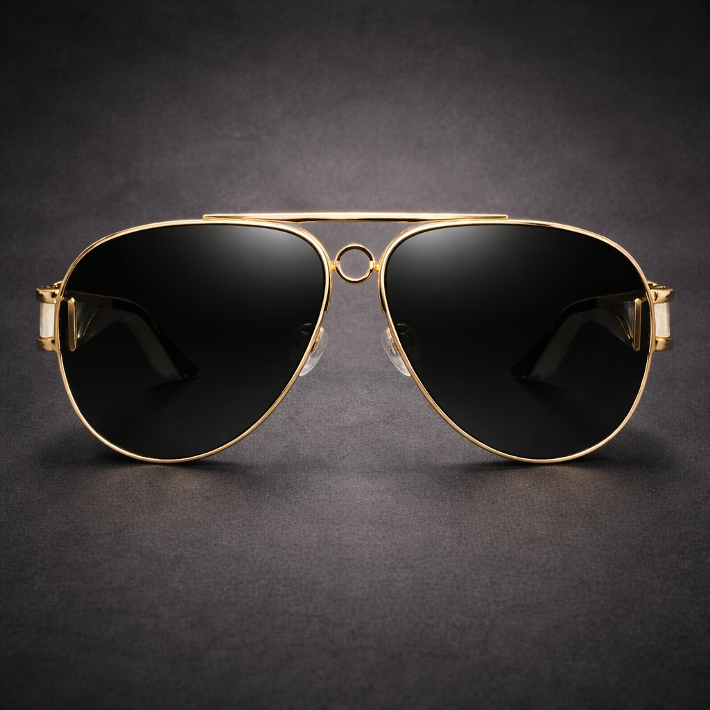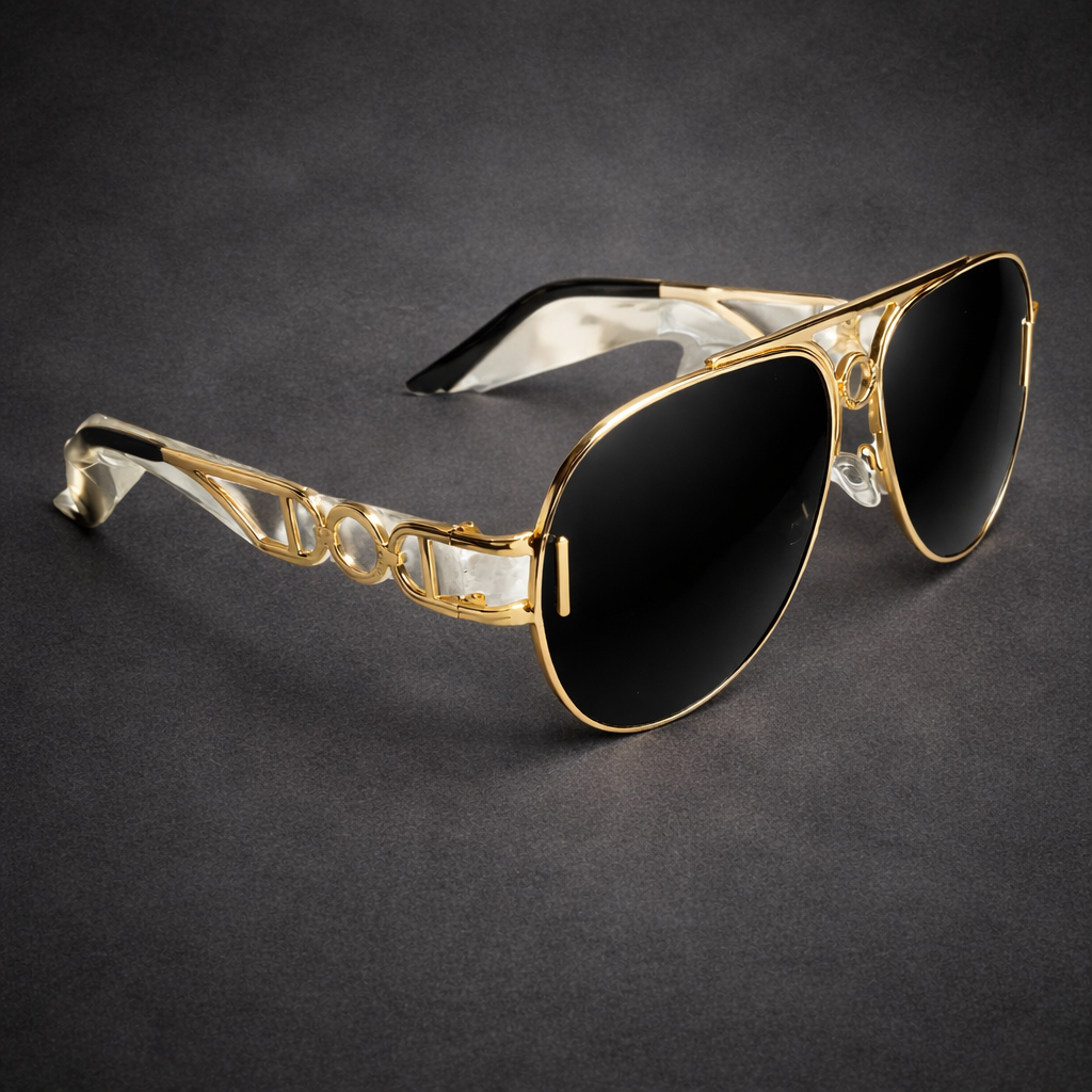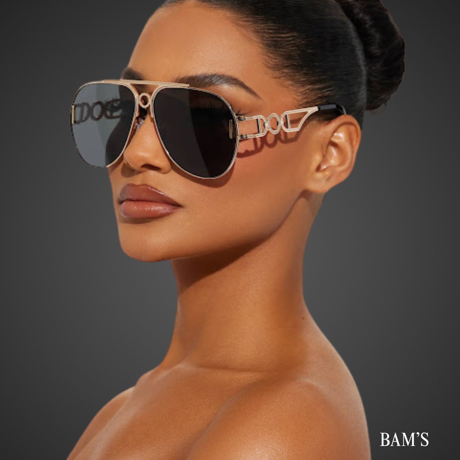 Statement aviators with bold designer-inspired side detailing that adds instant edge to any outfit. Lightweight metal frame with dark gradient lenses for a sleek, elevated look. Perfect for dressing up casual fits or finishing a glam vibe.