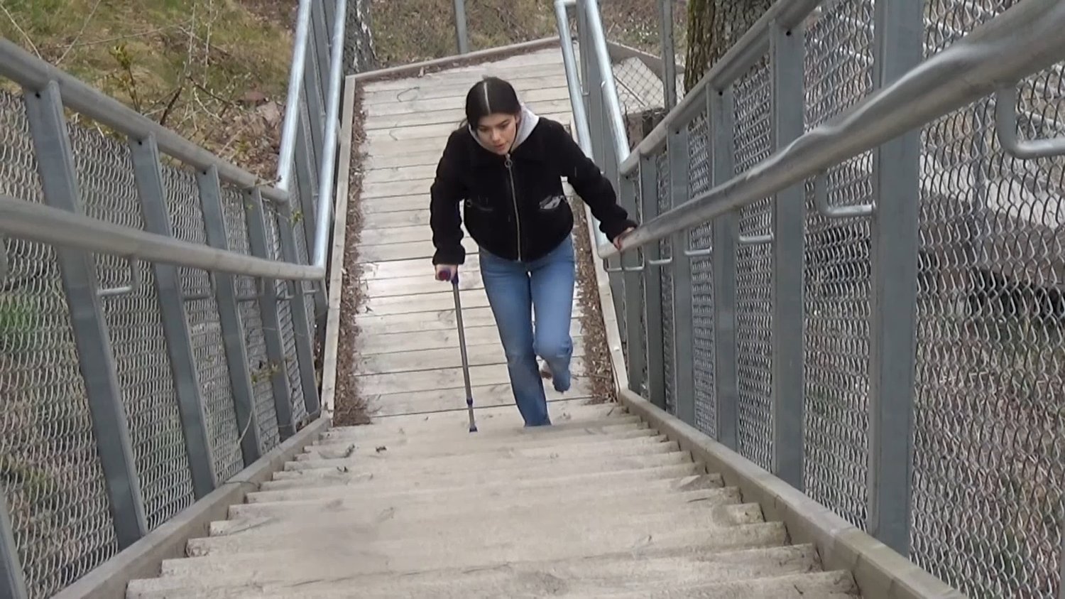 Pascale jumps up a longer staircase, one step at a time with a crutch in her right hand and with the help of the stair railing.