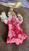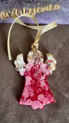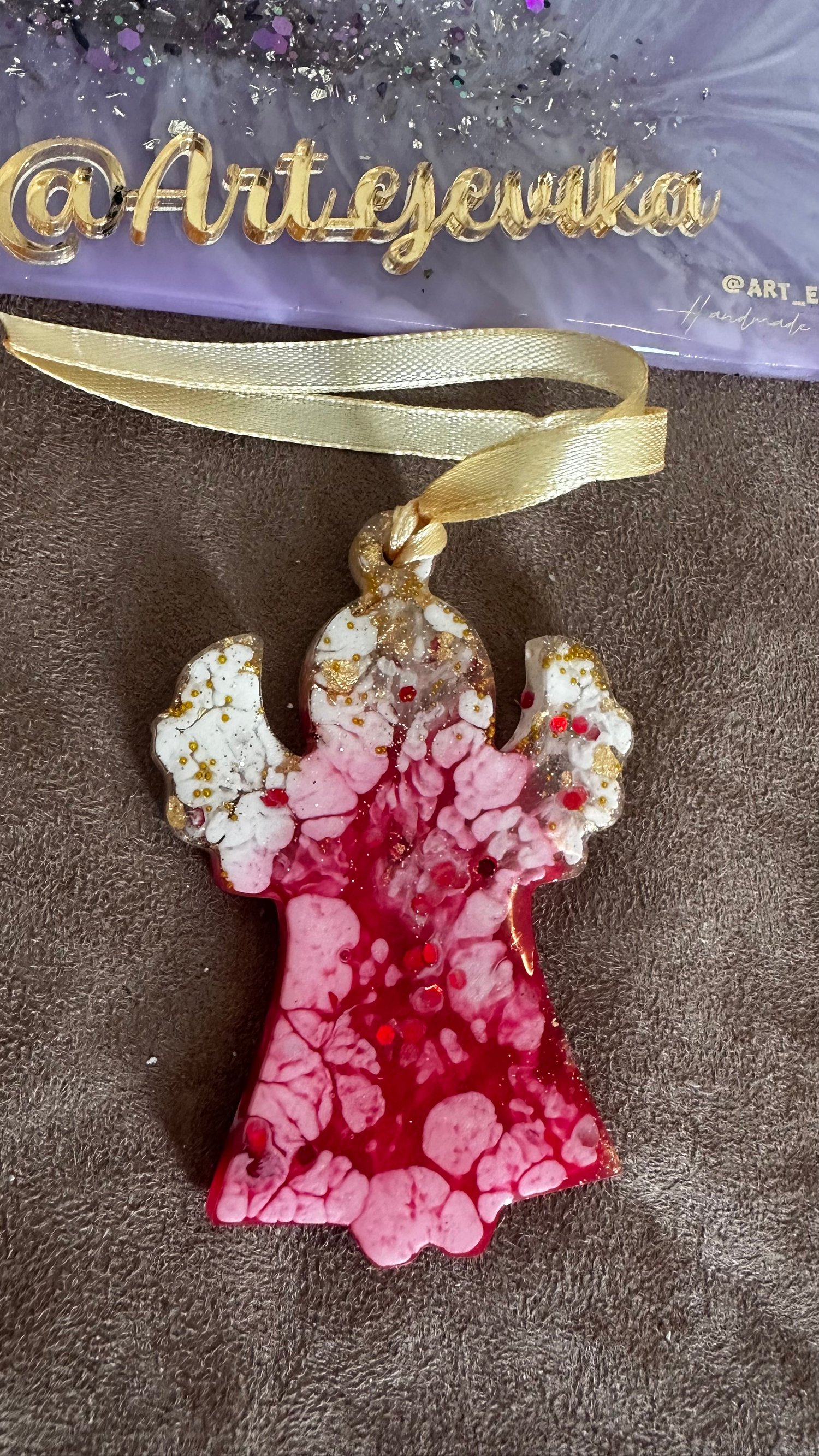 A unique ornament crafted in red and white tones with golden accents. The delicate texture and elegant design evoke a sense of warmth and hope. This piece will make a perfect addition to your holiday decor and highlight its uniqueness.