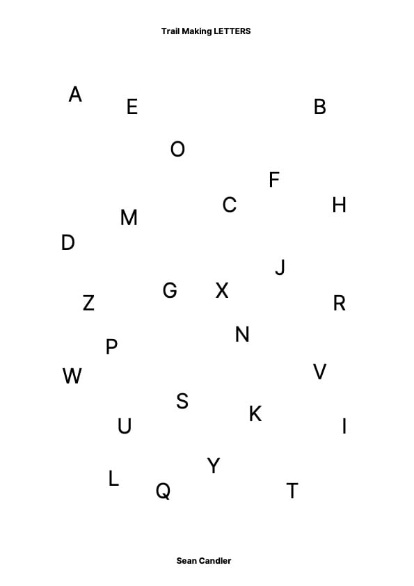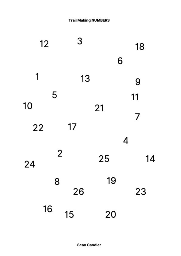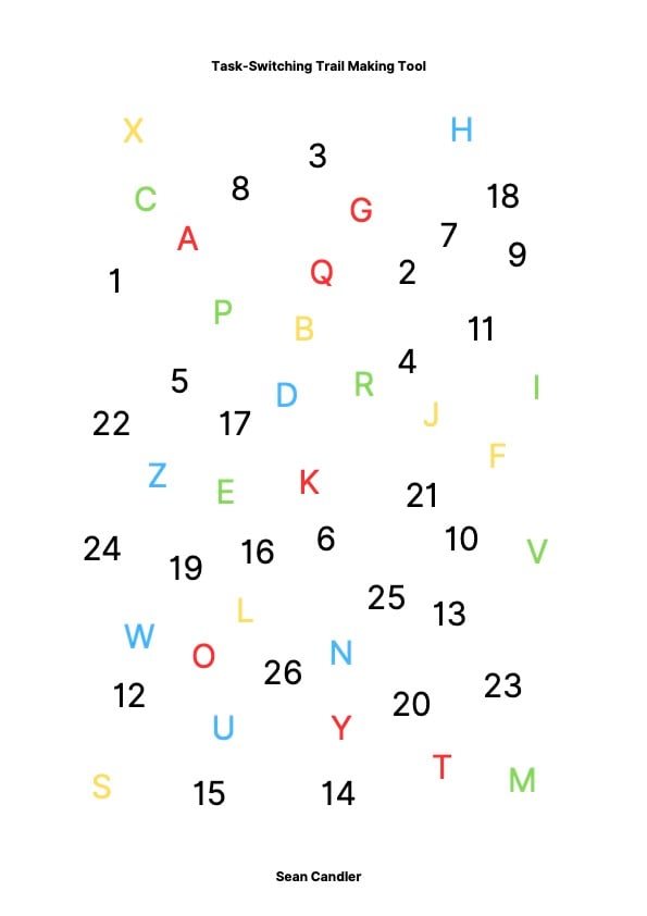 This PDF contains four progressive Trail Making Task variations, designed to systematically increase cognitive load, visual scanning demand, and executive control. The sequence progresses from letters only, to numbers only, then combined letters and numbers, and finally numbers paired with coloured letters to introduce a higher-order rule-based challenge .