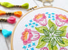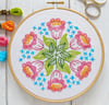 A mandala inspired hand embroidery pattern with pink tulips and blue stars.