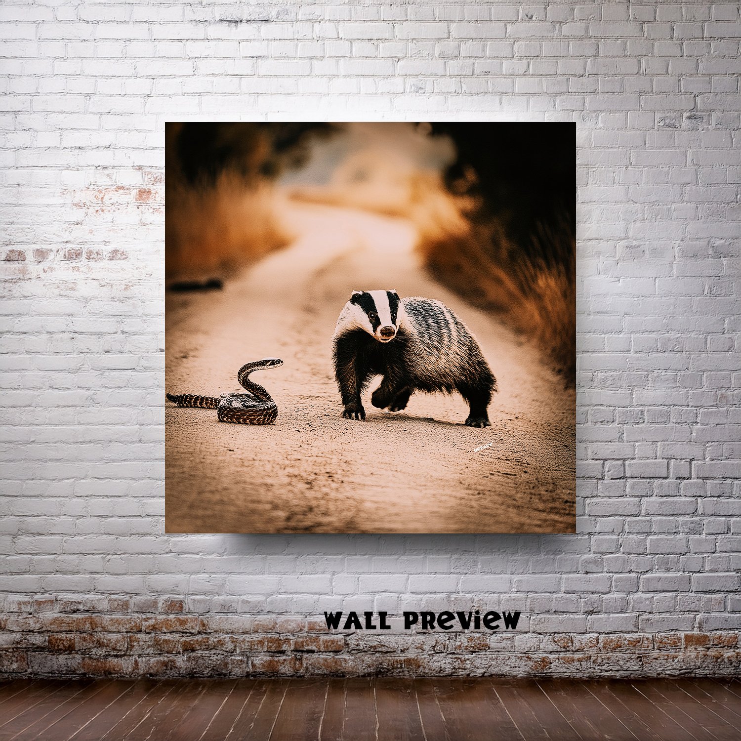 An extraordinary moment frozen in vintage color — a badger and a rattlesnake caught mid-race down a dusty country road. The faded hues evoke an era of roadside tales and tall stories, where nature’s drama played out beneath the open sky. With its warm tones and playful tension, this image blurs the line between folklore and reality, capturing a split second of wild, impossible motion.