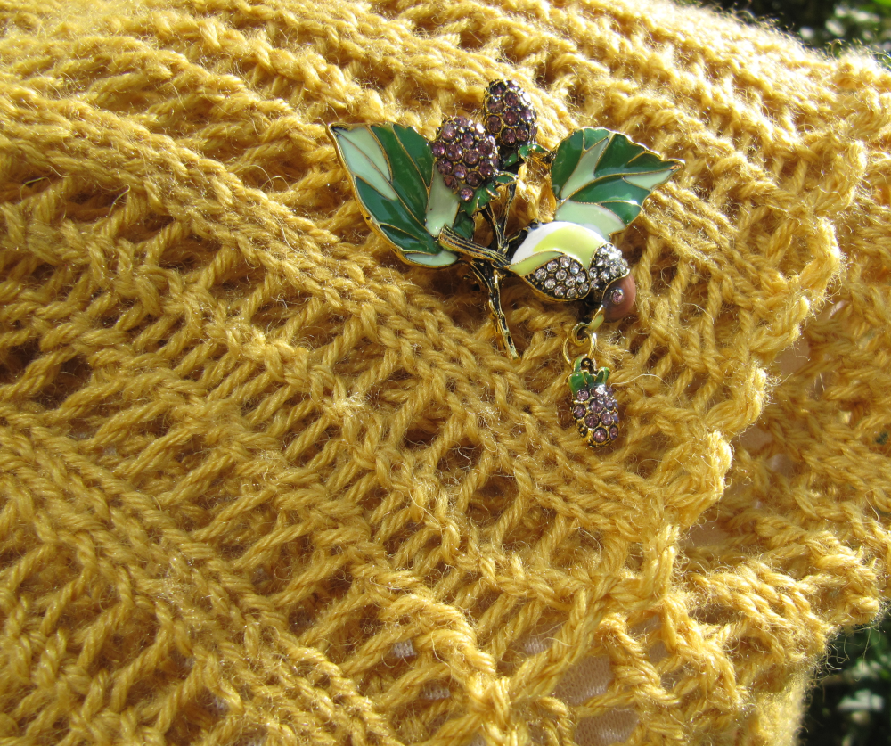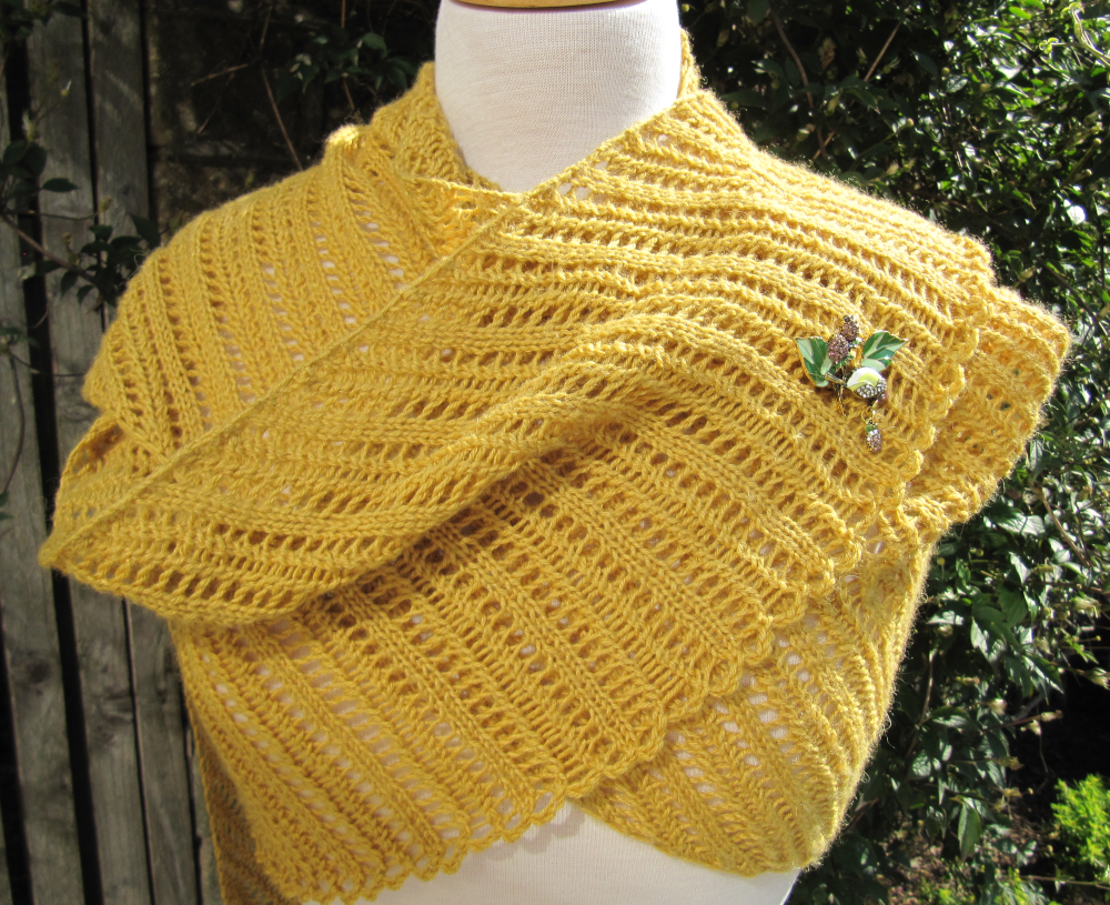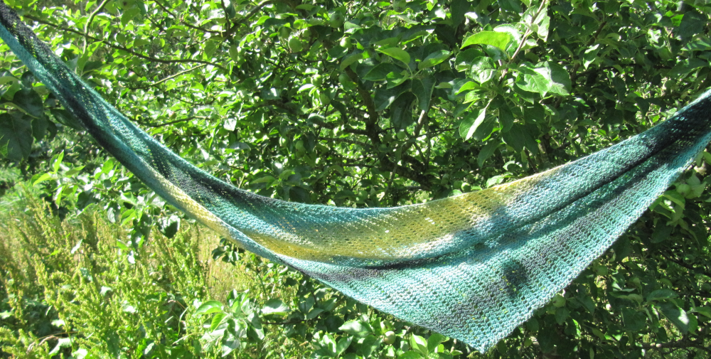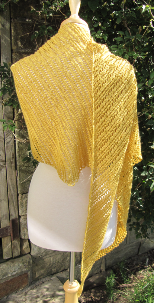 Lughnasadh the shawl is an asymmetrical triangular shawl with a memorable all-over lace pattern, knit on the bias from the pointy end, gradually increasing in width. It can be knit in any lightweight yarn, to any size, with a choice of two grounds, garter or stocking stitch/stockinette; and two cast offs, standard stretchy or crochet chain cast off.