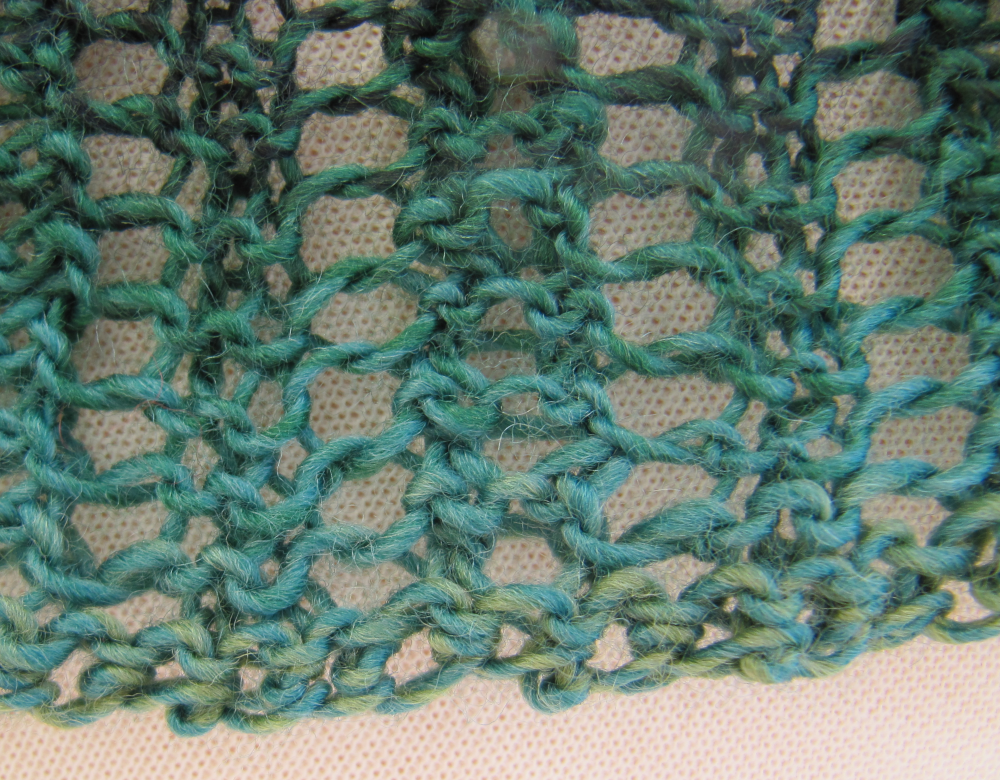 Measure the tension over the lace pattern after washing and blocking. Tension is not crucial for this shawl, but will affect yarn quantity.