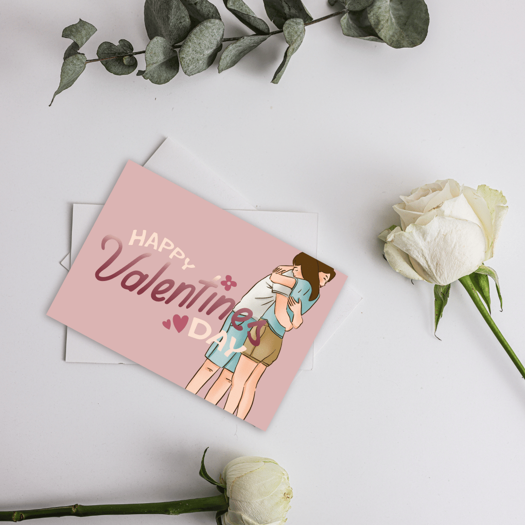 The design features sweet illustrations of a couple sharing tender moments, including a warm embrace and a gentle close-up, reminiscent of classic K-drama scenes. The text "Happy Valentine's Day" is displayed in soft, elegant fonts with playful floral and heart details, enhancing the romantic vibe.