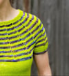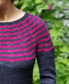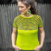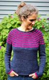Variation on a Twist is a top down, short-sleeved pullover with gentle waist shaping that leads to a slight A-line silhouette. (A long-sleeved option is also included in this pattern.) A simple garter and twisted stitch pattern adorns the yoke and only one color is worked per round. German short rows are used to shape the neckline after the yoke pattern is completed. (A link to a German Short Row video tutorial is included.)
