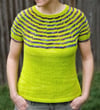 This sweater is designed to be worn with 0” to 4” of positive ease. The measurements given are the finished measurements. Gentle waist shaping gives way to a slight A-line look at the hips resulting in an approximate 2” larger hip circumference than the bust circumference. Additional options for body shaping are provided in the pattern. Options for slightly lengthening the short-sleeved version or for working a long-sleeved version are also included in the pattern.