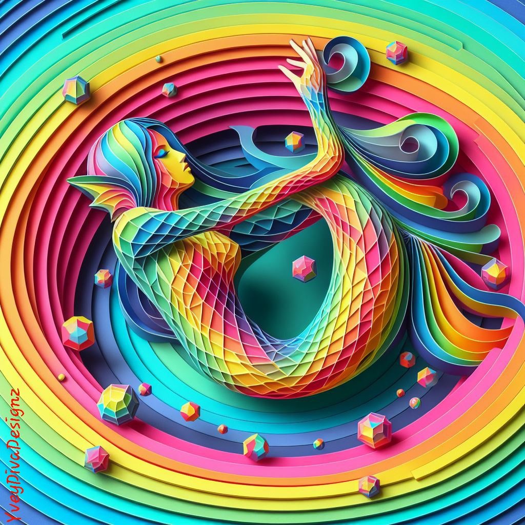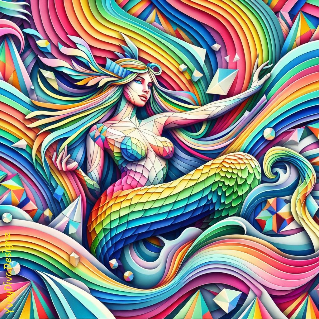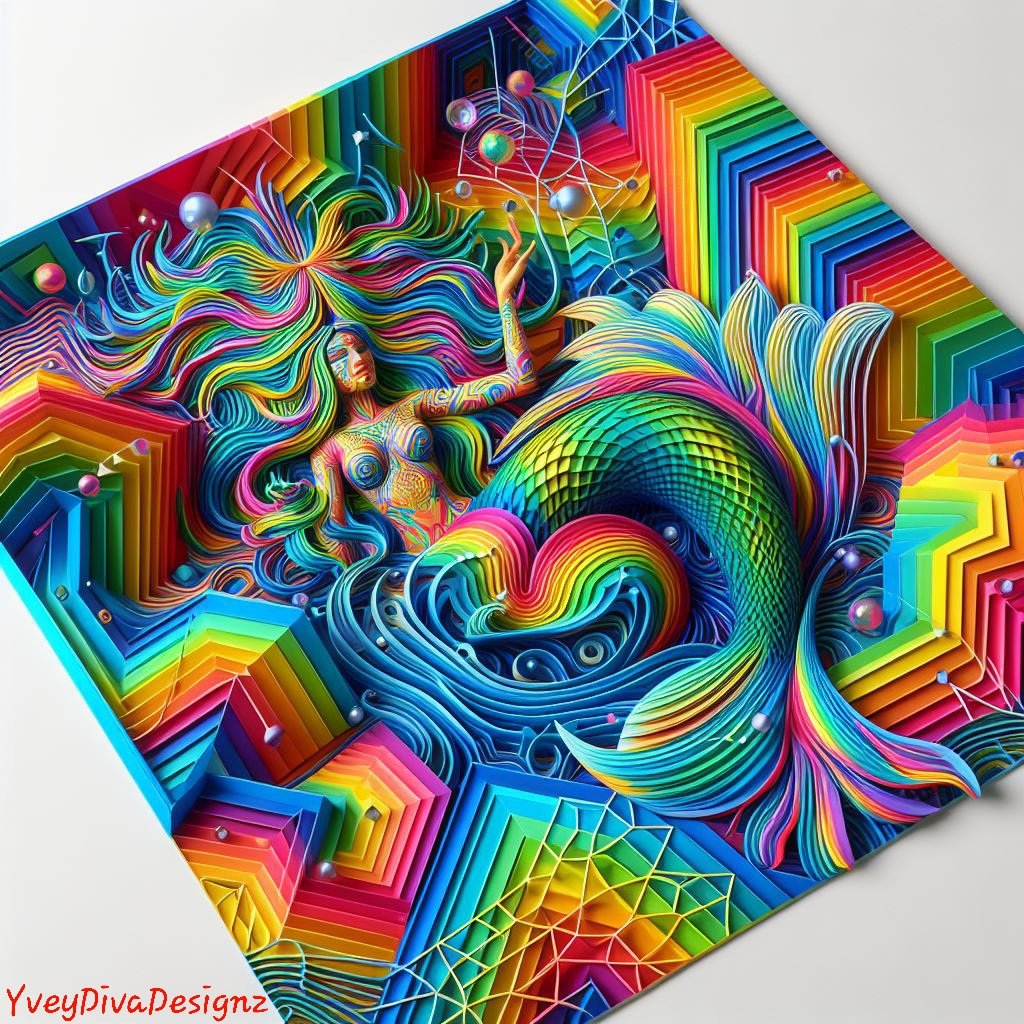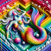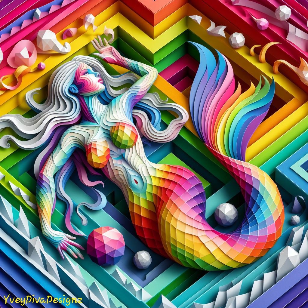 Prismatic Labyrinth: Rainbow Mermaids in the Maze" It reflects the colorful and intricate journey of rainbow mermaids navigating through a geometric maze. This title highlights the merging of the vibrant mermaids with the intricate patterns of the maze.