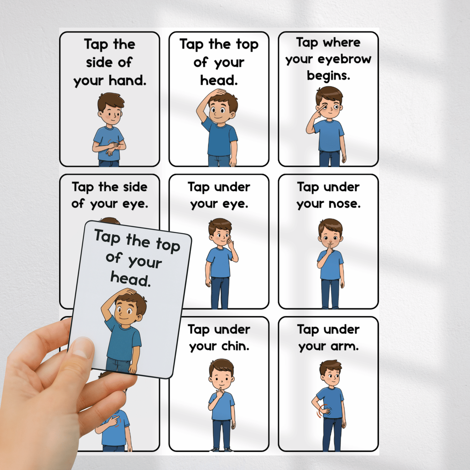 ✔ Simple directions like “Tap under your nose” and “Tap the top of your head”
