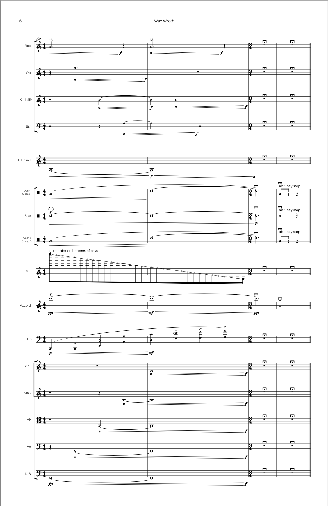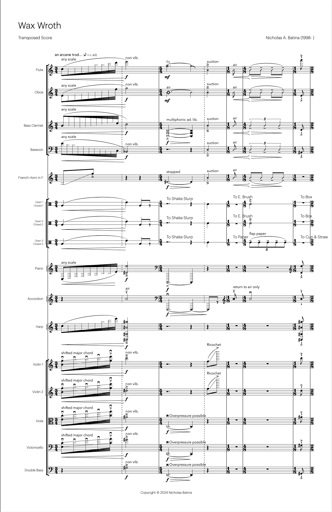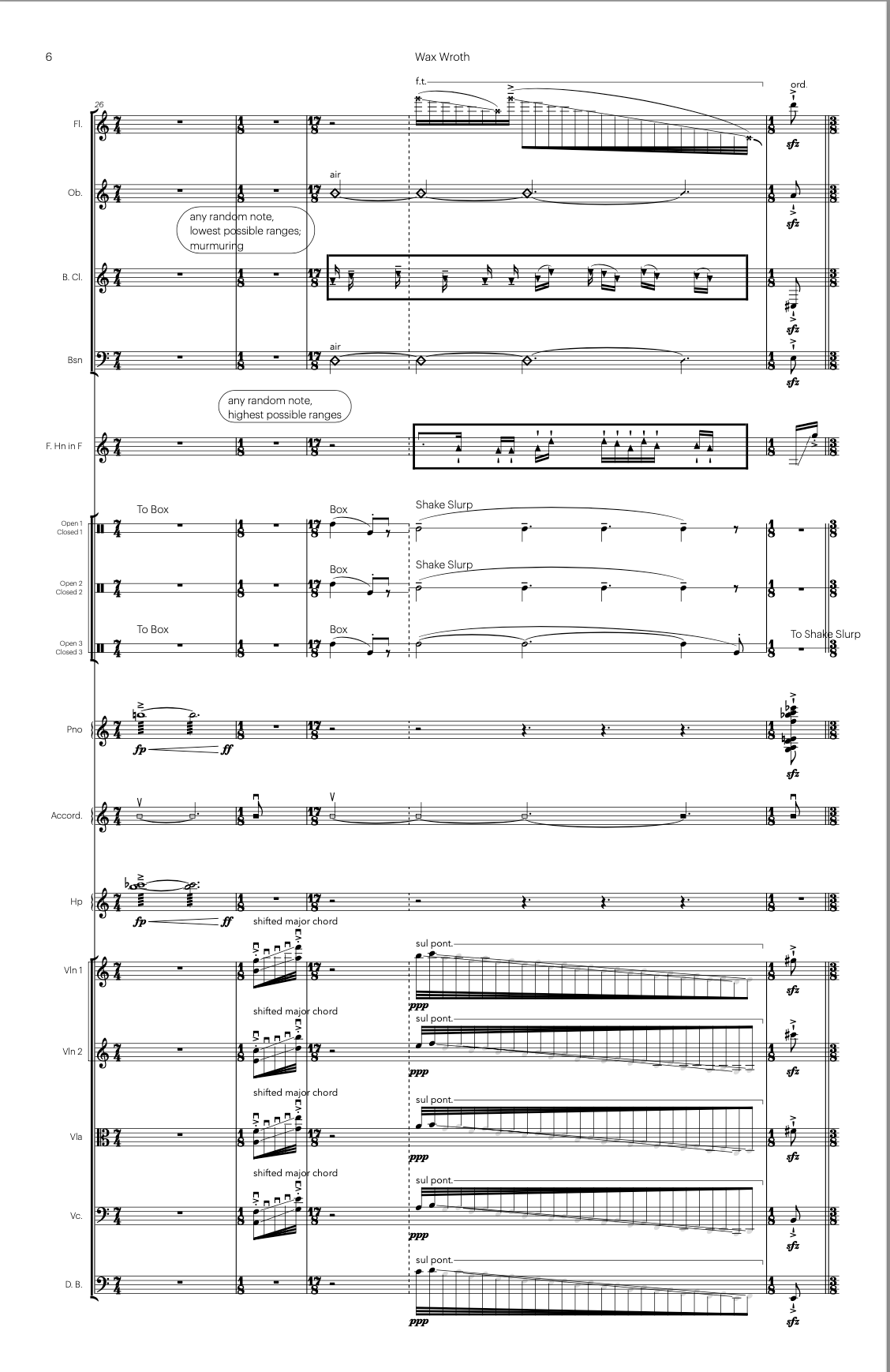 Wax Wroth is an exploration of extended techniques and sound networks. The idiom “wax wroth” means, “to speak or write in an angry, indignant, or wrathful manner”. The goal of this piece, however, is not wrathful sound, but a convergence of visual and auditory stimuli. The Accordion is to be featured prominently at the front of the stage, as a soloist, but will perform air sounds in lockstep with cues given to the ensemble. Wax Wroth aims to replace the Accordion’s reeds with the “reeds” of the full ensemble.