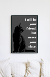 Celebrate the spirit of independence with this striking digital artwork of a black cat, featuring the bold statement: "I will be your friend but never your slave." Perfect for cat lovers who admire their feline friends' free-spirited nature.