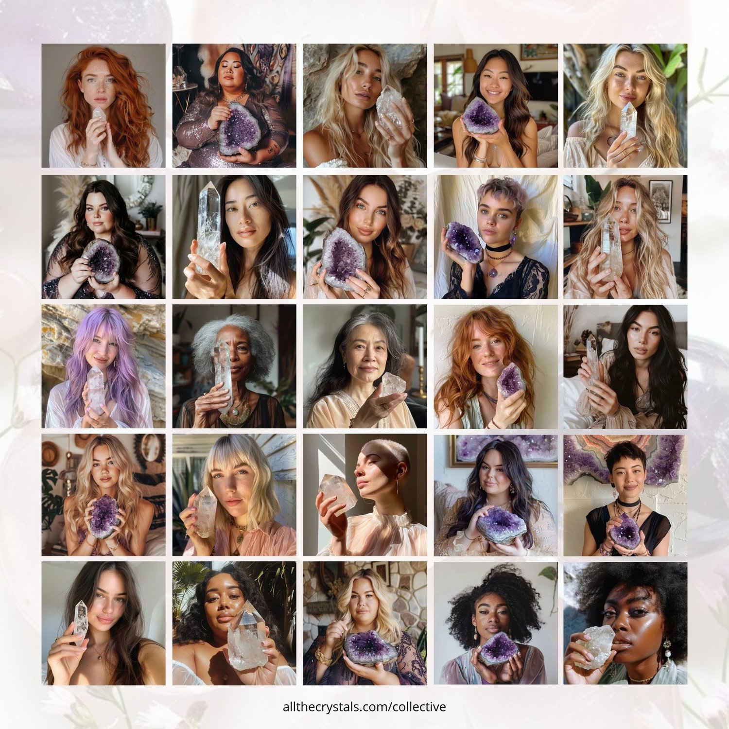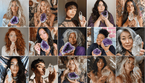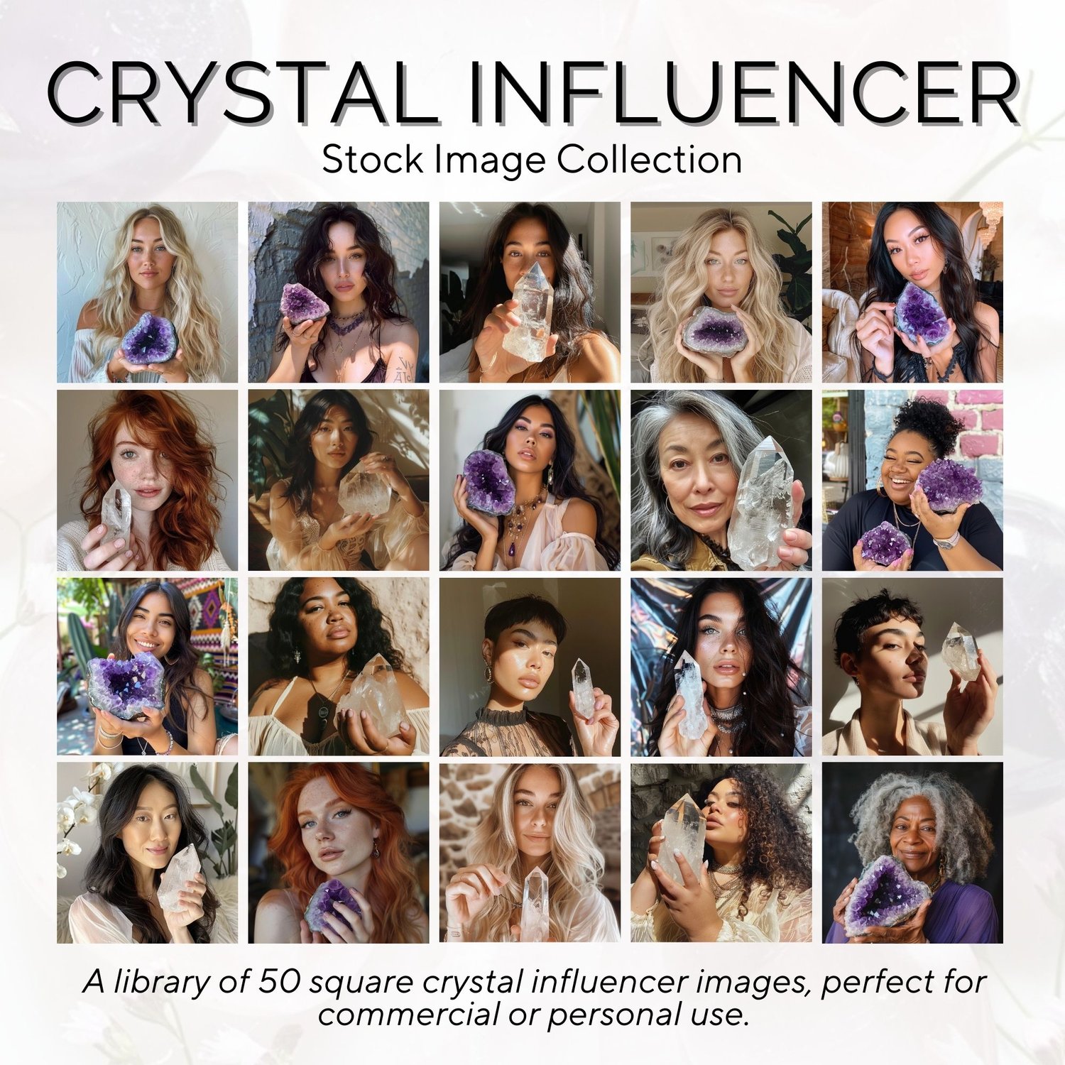 Featuring a diverse group of realistic models holding quartz and amethyst crystals, these images are great for grabbing attention, making your point, and tailoring your message to your target audience.
