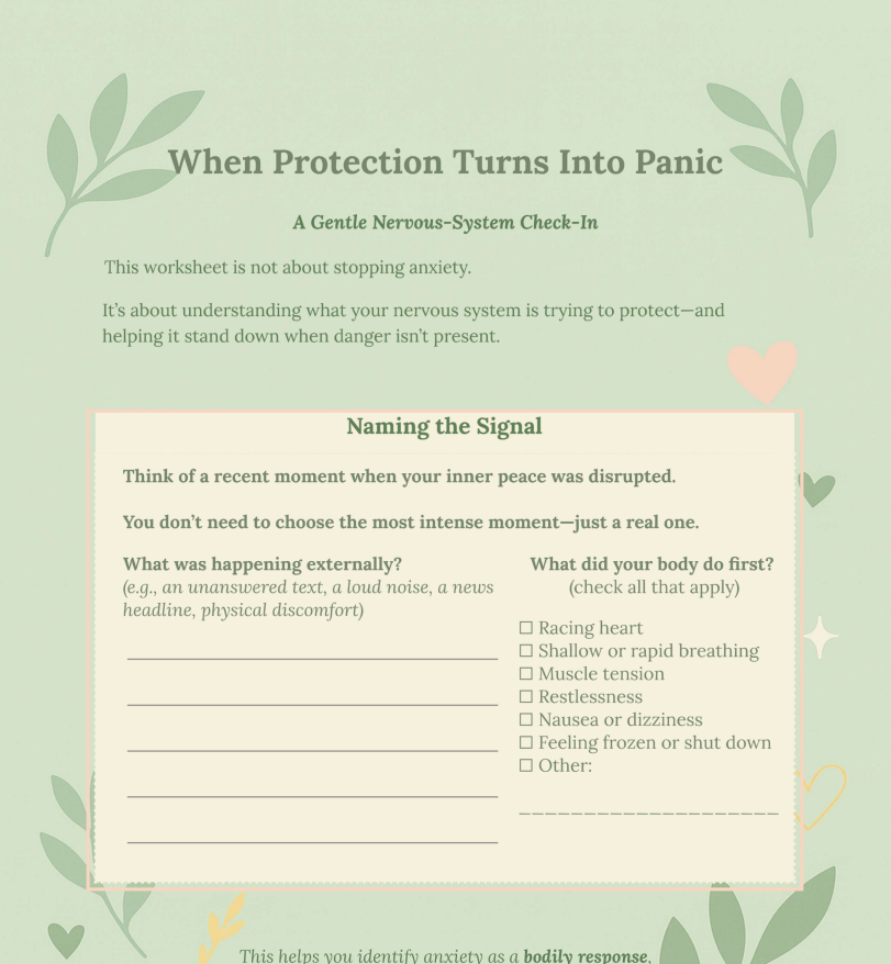 When Protection Turns Into Panic is a printable, trauma-aware worksheet designed to help you understand what’s happening in your body when worry and anxiety take hold—and to gently guide your nervous system back to safety.