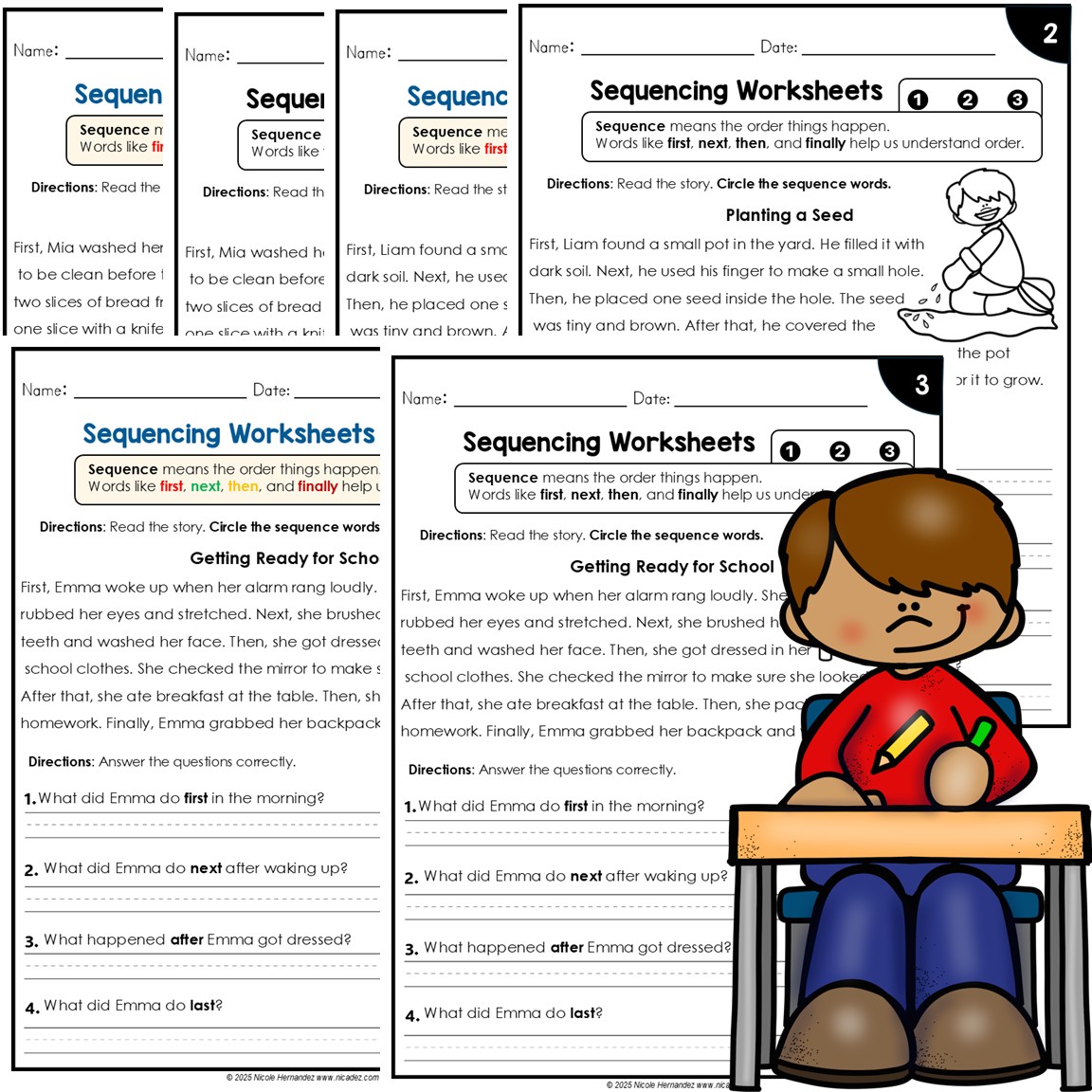 These sequencing worksheets go beyond cut-and-paste or multiple-choice activities by requiring students to write complete responses that explain the order of events. Designed to strengthen reading comprehension, retelling, and expressive language, each worksheet asks students to identify what happened first, next, and last, and explain their thinking in writing.