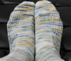 These socks are knit cuff down, with a heel flap and gusset and a wide toe. The gusset decreases are moved to an unusual location that results in a heel that hugs the foot. The twisted stitch panel is placed on the outside of each foot and perfectly mirrored.