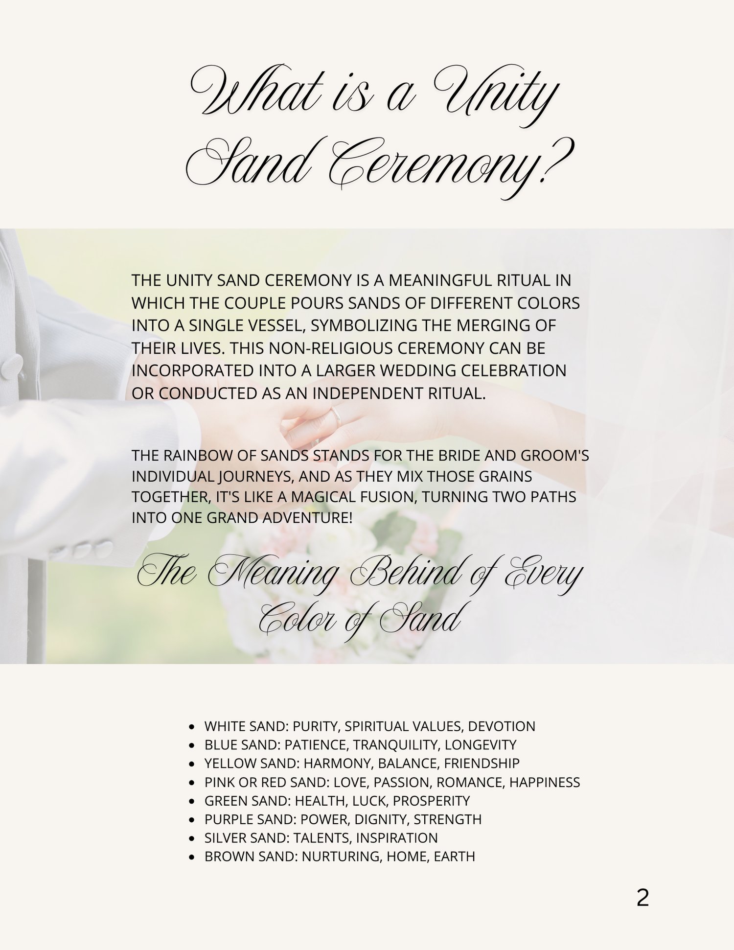 As a bride or Planner this guide will help you to decide which wedding Nuptials will be best for your Ceremony, its informative guide is packed with the meaning of different types of ceremony ideas from why choose a candle ceremony and what dose it mean to silly or love quotes to add to the perfect touches on your vows, we absolutely love this guide because we have given it to our brides to ease the stress of trying to figure out which added touch they would like for their big day.
