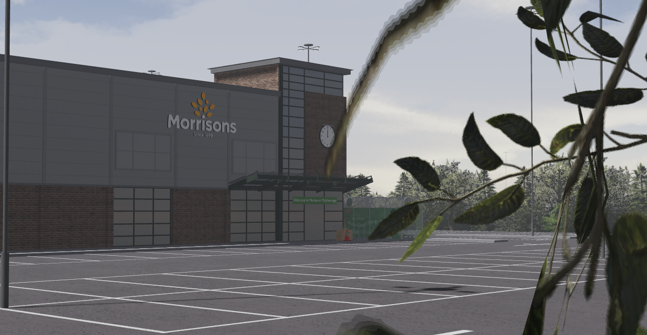 Morrisons, based off the location in middlewhich, is a massive store containing a realistic car-park, with assets included. It also contains 3D-Meshed Signage, roads leading up, the build and comes included in Morrisons Petrol Station.