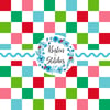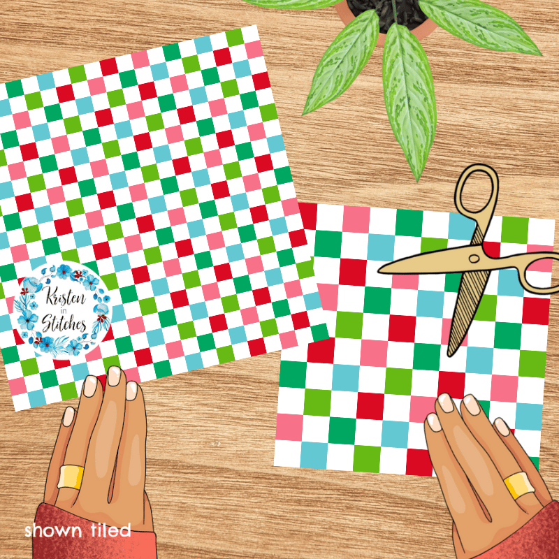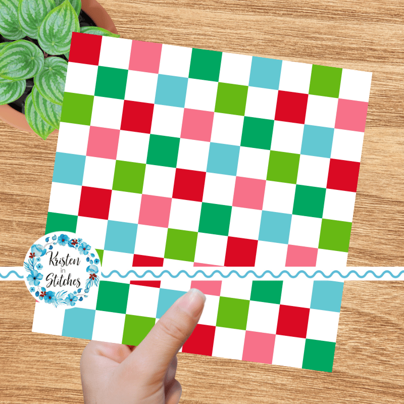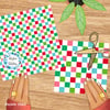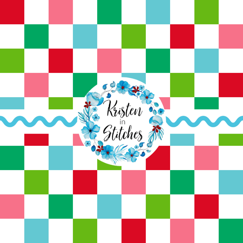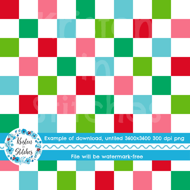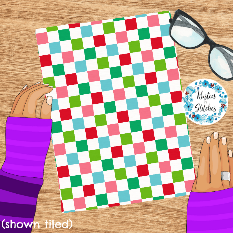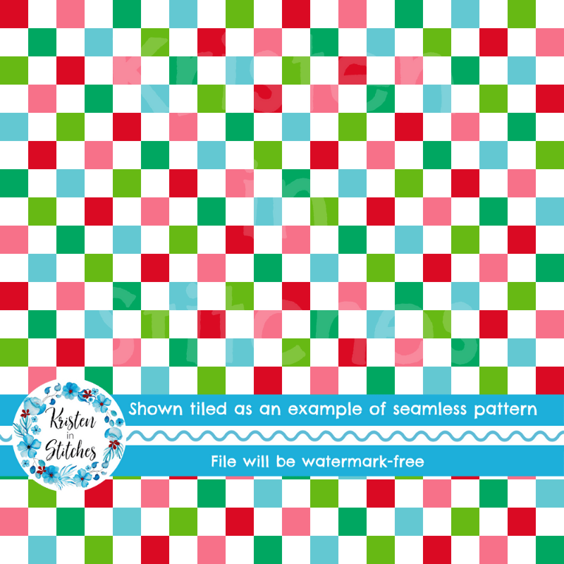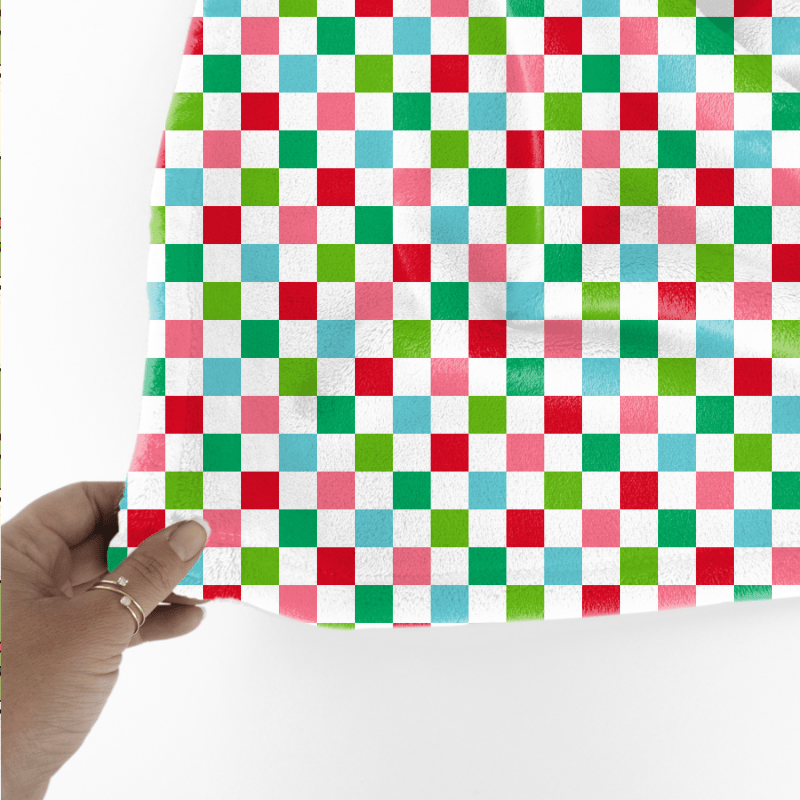 Festive checker pattern in red, pink, green and blue.