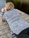 This intriguing and elegant, yet simple Voyager Sweater starts with 2x2 Rib hem, with a side opening. The front and back are joined and worked in the round for two (shorter), or three (longer) pattern repeats. At the armscye continue to work flat, separately for front and back. The two sides are joined at the shoulders by Kitchener stitch. The stitches for the sleeves are picked up along the armscye, start at the underarm, pick up the stitches at the front, continue at the back and join the stitches in the round. Knit the sleeves top down in the round with slight bell shape towards the bottom. The cable is done in the front and back with purl columns next to it, while the rest of the sweater is worked in stockinette stitch. A turtle neck collar of 1x1 (or 2x2) rib is worked from picked up stitches along the neck opening.