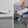 He appears to have undergone surgery on his Achilles tendon, as his foot was immobilized in an equinus position, and his toes still show traces of disinfectant, resting on a sturdy toe plate.