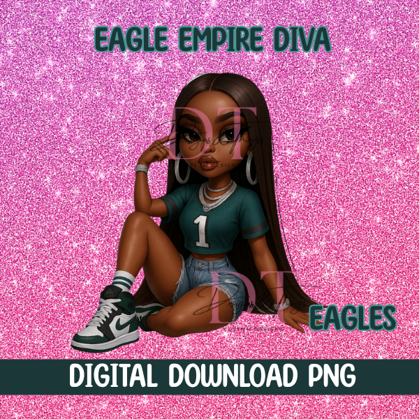 Soar into football season with our Eagle Empire Diva PNG! This fierce, custom-designed diva is draped in bold green, black, and silver—perfect for Philly fans who bring fashion and fire to game day. Whether you’re designing shirts, tumblers, mugs, or fan gear, this high-energy character is ready to rep the empire with style. Delivered as a high-resolution PNG with a transparent background, she’s perfect for all your creative and small business needs.
